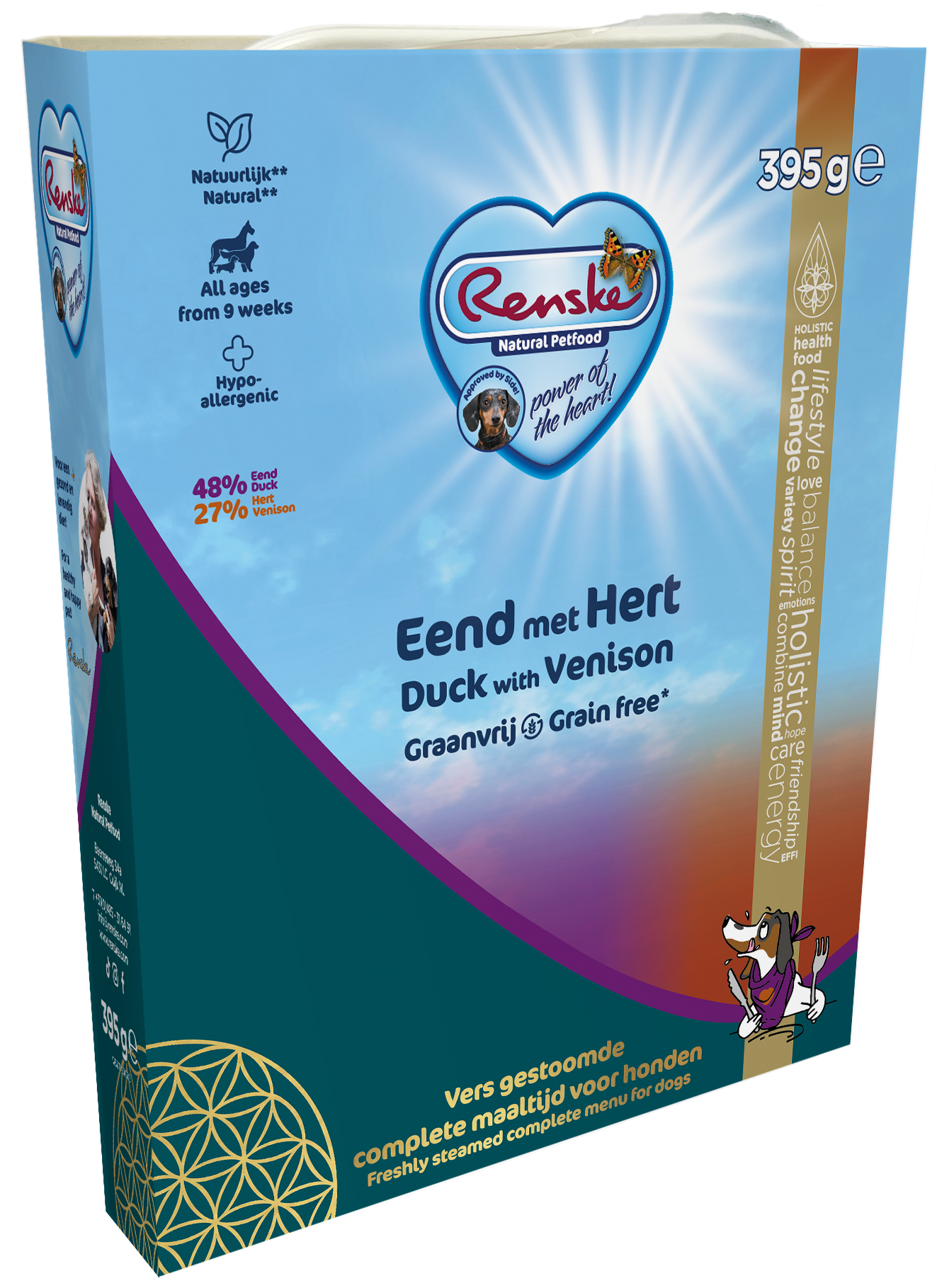 Renske gedämpftes Frischfleischfutter mit Ente und Wildbret ist ein getreidefreies Gericht für junge und erwachsene Hunde aller Rassen ab 9 Wochen. Das Produkt enthält mindestens 75% Ente und Wildbret und ist vollständig getreidefrei. Das Produkt ist mit Grüne bohnen und Aprikose angereichert.
