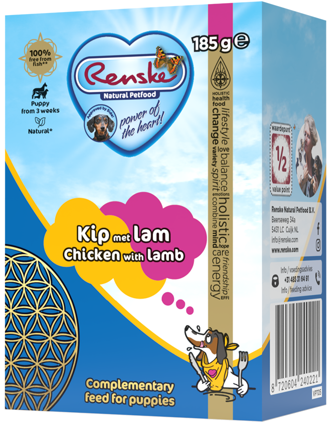 Renske Frisch zubereitete Fleischmahlzeit Huhn mit Lamm ist eine glutenfreie Zusatzmahlzeit für Welpen aller Rassen ab 3 Wochen. Das Produkt enthält 70 % frisch zubereitetes Huhn und Lamm und wird mit Reis und leckerem Gemüse ergänzt. Diese Mahlzeit ist speziell für den Welpen gedacht, um in den ersten Wochen das Fressen zu lernen. Ab der 9. Woche kann der Welpe die „Erwachsenen-Varianten“ fressen. Wir empfehlen, dann oft zu variieren. Die hochwertigen Zutaten machen die Mahlzeiten leicht verdaulich und für wählerische Esser geeignet! In handlichen Kleinportionen verpackt, ideal auch für unterwegs oder im Urlaub.