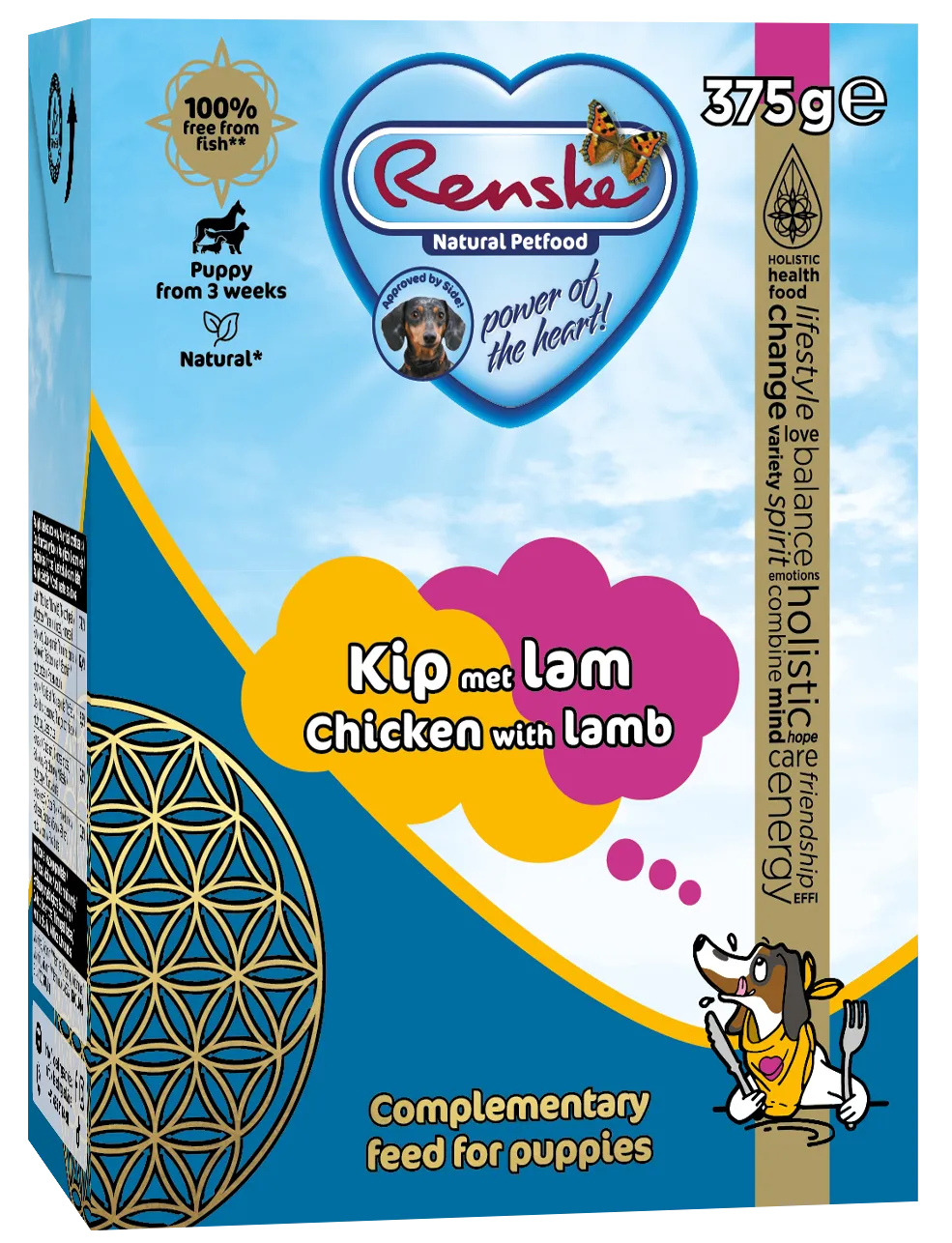 Renske Frisch zubereitete Fleischmahlzeit Huhn mit Lamm ist eine glutenfreie Zusatzmahlzeit für Welpen aller Rassen ab 3 Wochen. Das Produkt enthält 70 % frisch zubereitetes Huhn und Lamm und wird mit Reis und leckerem Gemüse ergänzt. Diese Mahlzeit ist speziell für den Welpen gedacht, um in den ersten Wochen das Fressen zu lernen. Ab der 9. Woche kann der Welpe die „Erwachsenen-Varianten“ fressen. Wir empfehlen, dann oft zu variieren. Die hochwertigen Zutaten machen die Mahlzeiten leicht verdaulich und für wählerische Esser geeignet! In handlichen Kleinportionen verpackt, ideal auch für unterwegs oder im Urlaub.