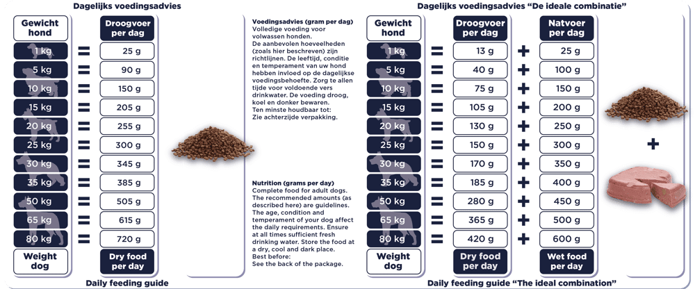 Alle unsere Trockenfuttermittel sind vollwertig, was bedeutet, dass das Futter alle Nährstoffe enthält, die Ihr Hund braucht. Sie können die Brocken mit unseren Frischfleischgerichten kombinieren, sogar in ein und derselben Mahlzeit. Wir empfehlen, wenn möglich, viel in den Geschmacksrichtungen zu variieren. Dies hält das Immunsystem Ihres Hundes aktiv und verringert die Wahrscheinlichkeit, dass Ihr Hund Unverträglichkeiten oder Allergien entwickelt oder sich auf Dauer langweilt. Wir essen auch nicht gerne jeden Tag dasselbe, oder?