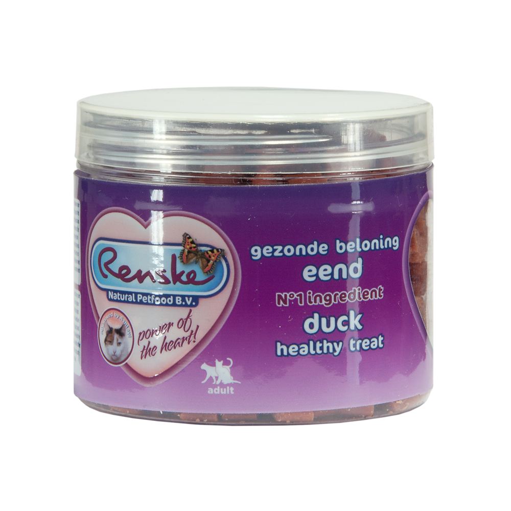 Eine Belohnung in Herzform mit Ente als Hauptzutat, 91%. Die Belohnungen sind geeignet für Katzen aller Rassen ab 9 Wochen. Ideal in Kombination mit dem Renske Variationsmenü. Auch für diese Belohnung wurde nur eine einzige Proteinquelle verwendet. Somit können auch Katzen mit einer Allergie oder Unverträglichkeit gegen eine bestimmte Proteinquelle die Belohnungen genießen.