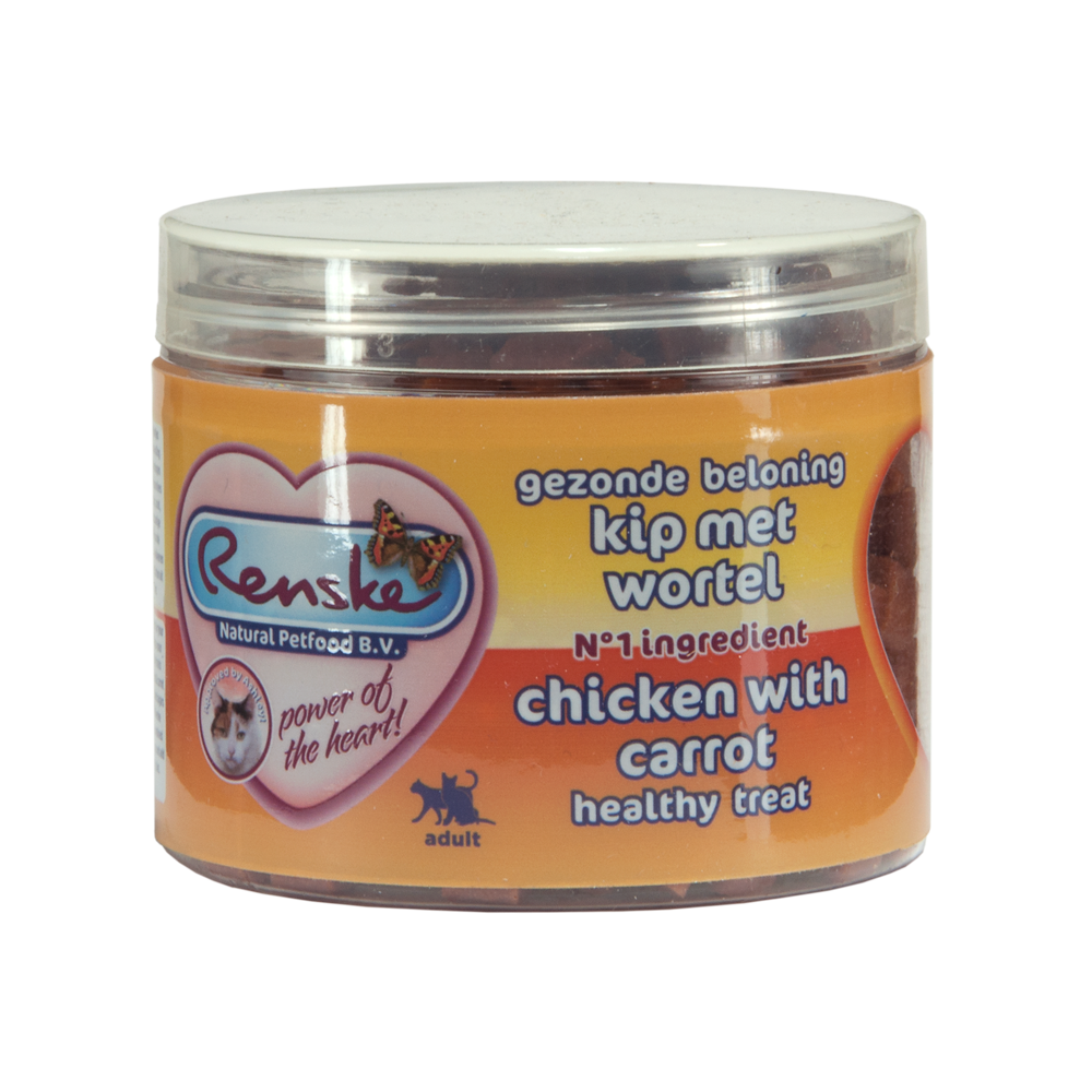 A heart-shaped treat, with 86% chicken as the main ingredient. These treats are suitable for cats of all breeds, from 9 weeks of age. Ideal in combination with Renske's variation menu. This treat has one single source of protein. This means cats with an allergy or intolerance to a particular protein source can also enjoy these treats.
