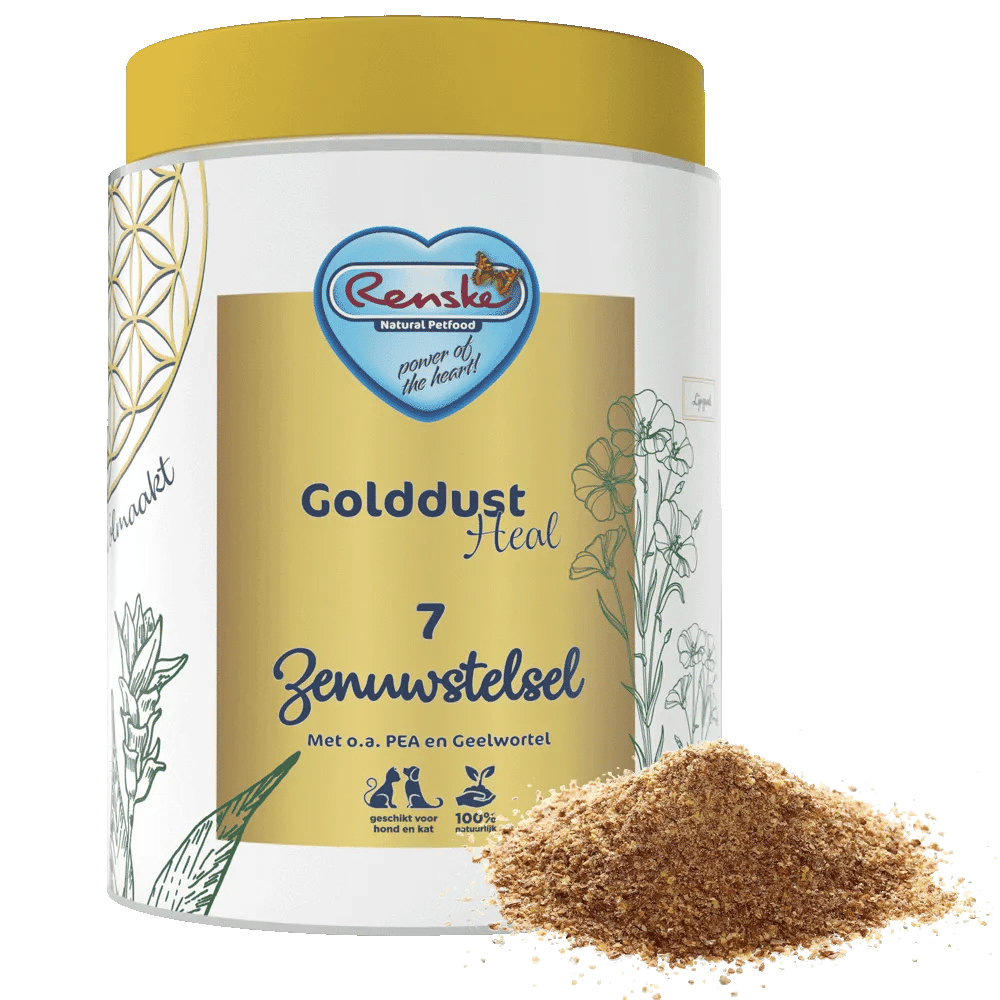Golddust Heal is a 100% natural range of food supplements specially designed for dogs and cats. These supplements are all ‘Bio-Energetically Perfect’, which means their ingredients are tailored to the energetic nature of your animal to make the product even more effective. They contain an abundance of naturally occurring vitamins, minerals, amino acids, essential fatty acids and fibres, and are a rich source of omega-3 fatty acids and vegetable lignans (phytoestrogens) thanks to the addition of pure linseed from Canada. Here, the linseed is ground on the spot in a specific method that retains the fat molecules. Because of this, the product has a shelf life of 2 years. With added active herbs that can help with specific physical complaints. The ingredients of each variety offer optimal benefits.