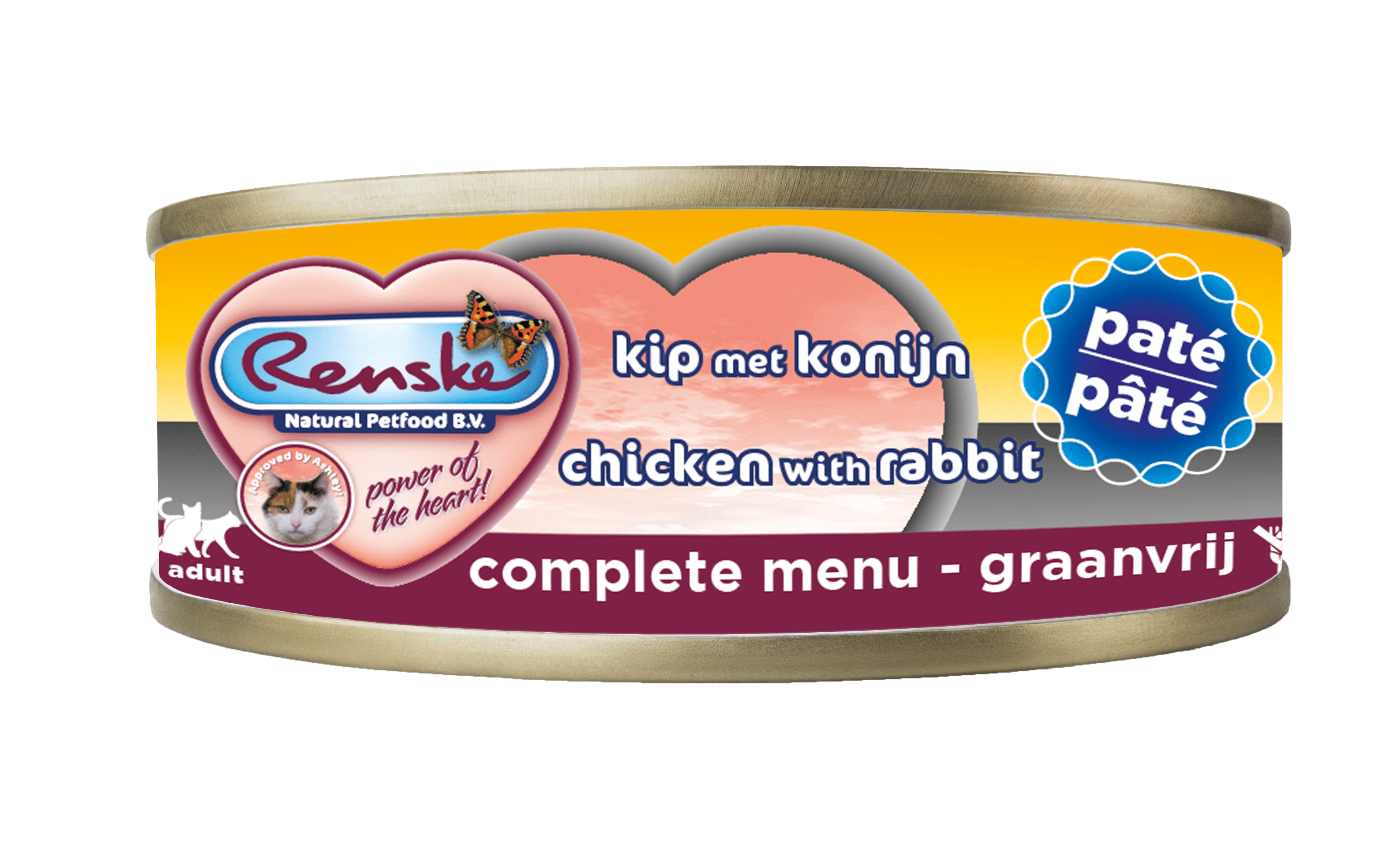 Renske 70g - chicken and rabbit is a tasty complete wet food for cats. Due to its high chicken content, this is a very easily digested and tasty meal, and is completely free of sugars, salt, chemical preservatives, colourings, taste enhancers and flavourings.