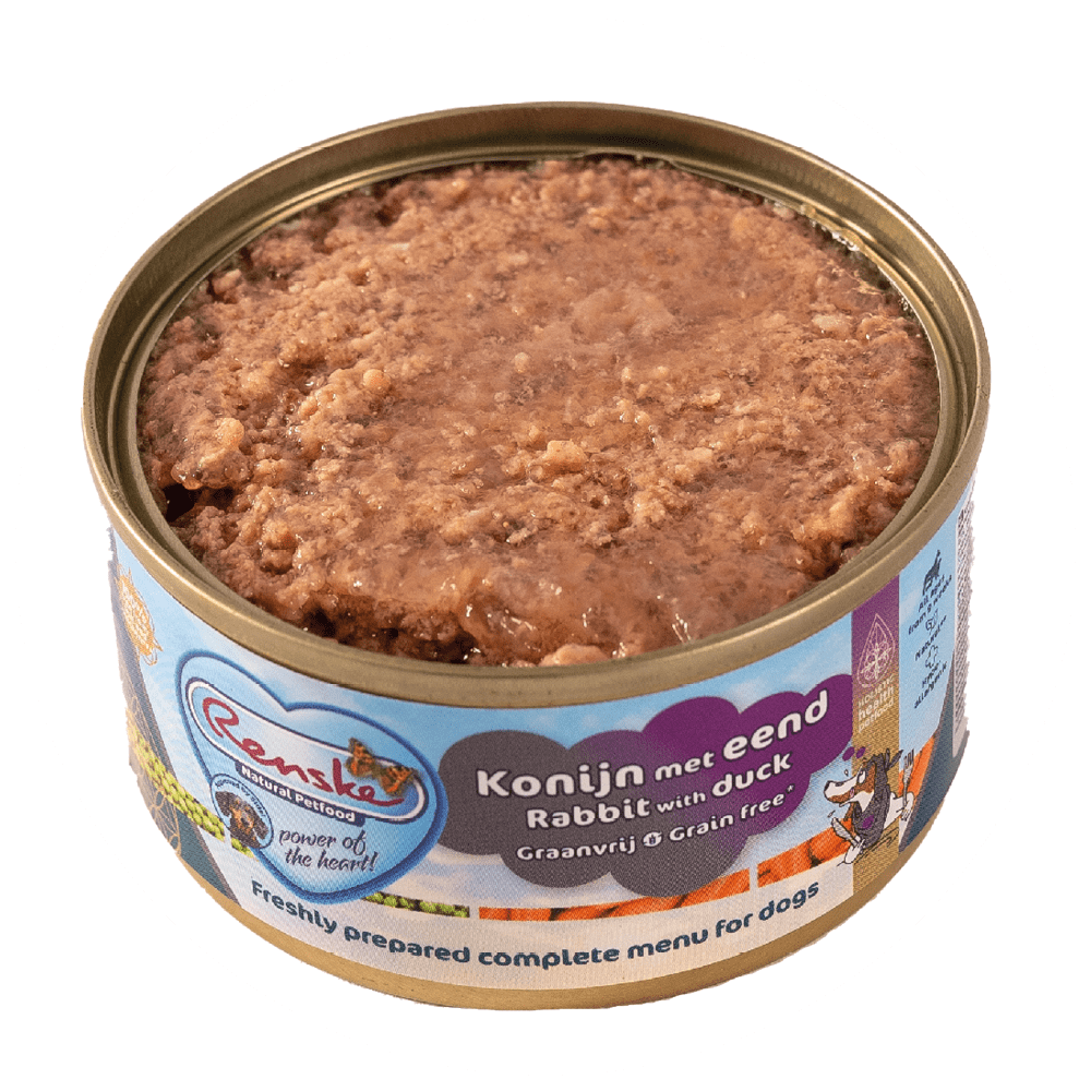 Rabbit 40%, duck 20%, peas 3%, carrots 1%, dried algae (Fucus vesiculosus) 0.06%, xylooligosaccharide, sea-buckthorn, yucca schidigera extract.
