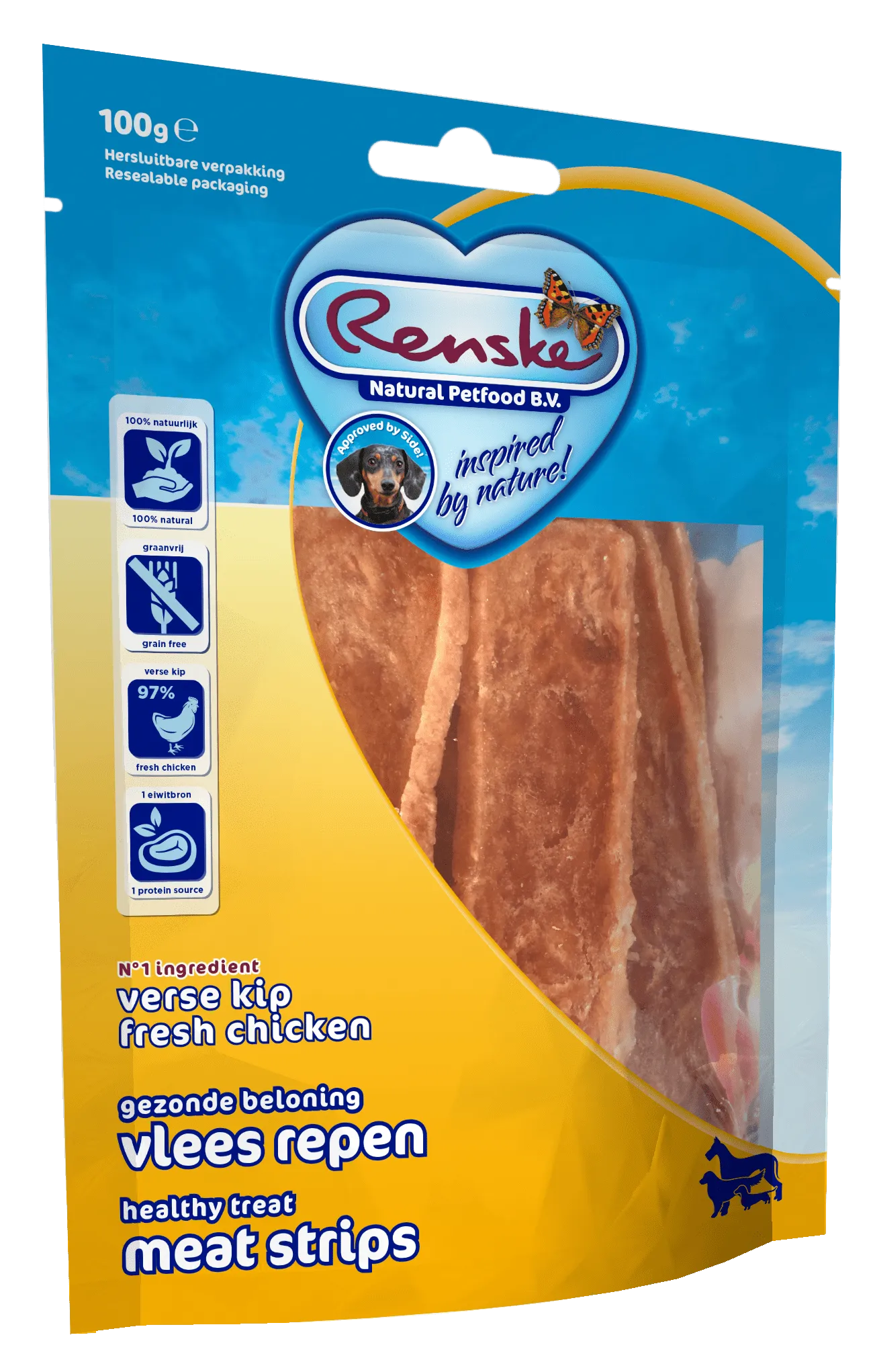 Then you need our Meat Bars! These delicious bars are healthy, tasty and good for the teeth. By using one single source of protein, these treats are also very suitable for dogs with allergies, or in an elimination diet. The flavours are identical to the other Renske menu products.