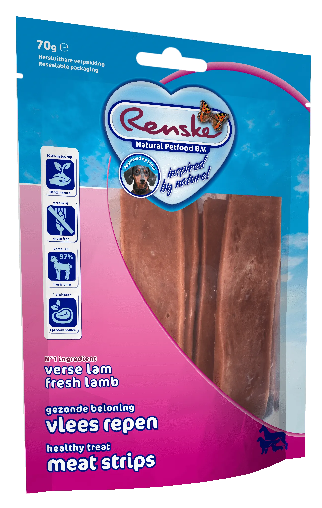 Then you need our Meat Bars! These delicious bars are healthy, tasty and good for the teeth. By using one single source of protein, these treats are also very suitable for dogs with allergies, or in an elimination diet. The flavours are identical to the other Renske menu products.