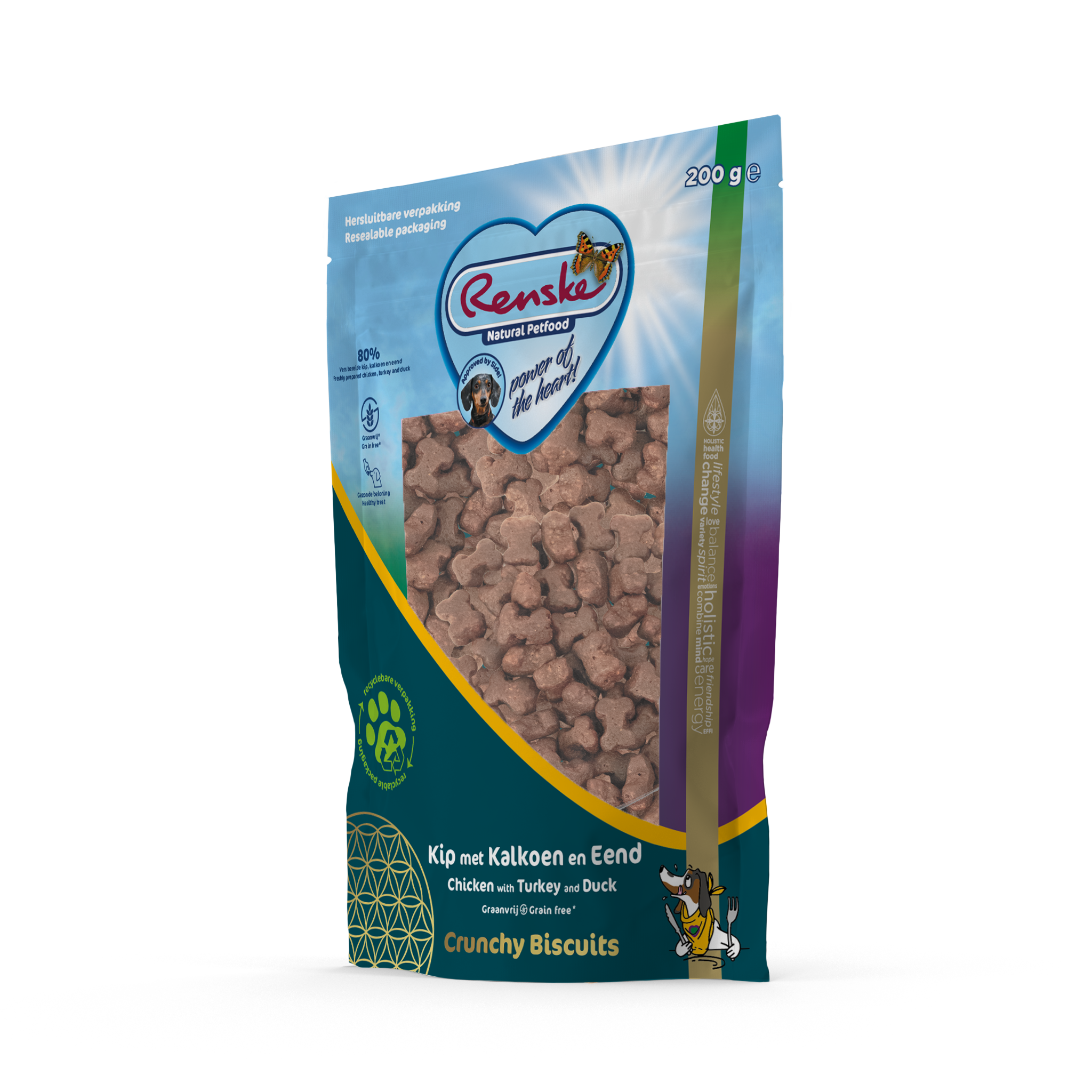 Renske Crunchy Chicken with Turkey and Duck biscuits are a good, tasty addition to your dog’s daily menu. You can give this reward to your dog as a treat or snack.