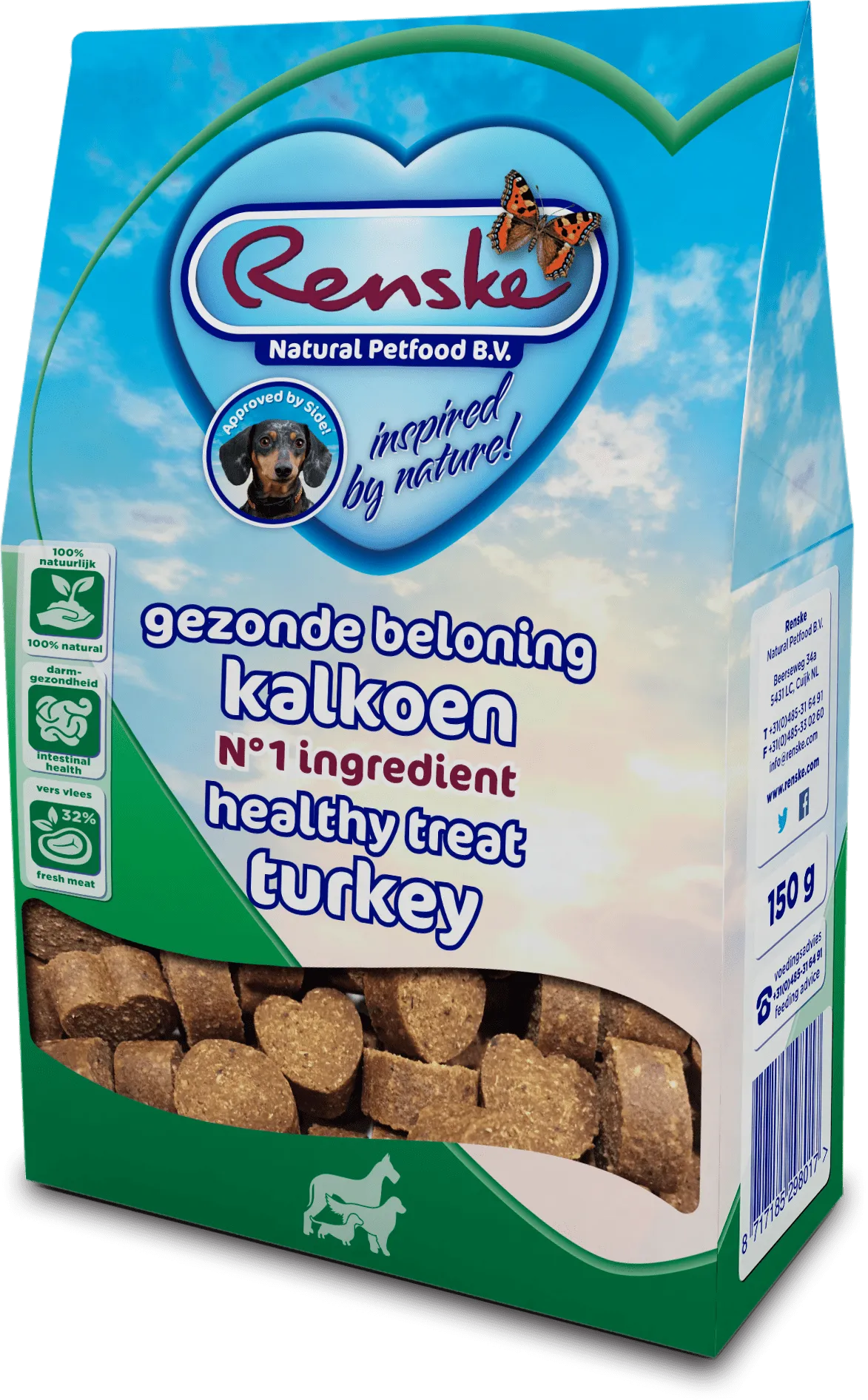 Ideal as a responsible snack or a training treat! A heart-shaped treat, with at least 32% turkey as the main ingredient. These treats are suitable for dogs of all breeds, from 9 weeks of age. Ideal in combination with Renske's variety menu. The treat has one single source of protein. This means dogs with an allergy or intolerance to a particular protein source can also enjoy these treats. These rewards contain no salt or sugar, and are 100% natural with added vitamins and minerals.