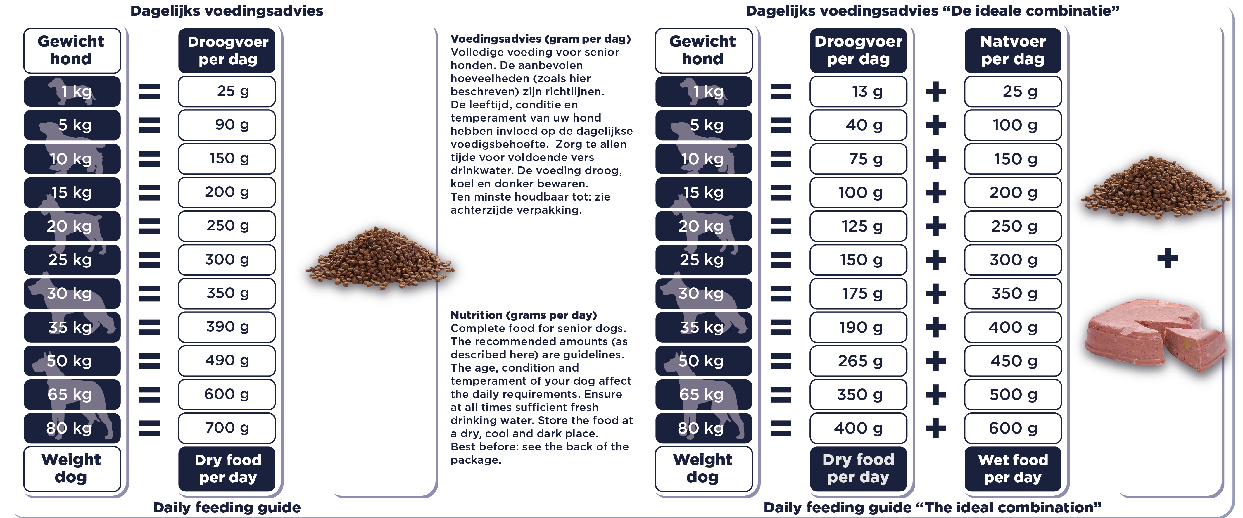 Nos aliments secs sont tous complets, ce qui signifie qu'ils contiennent tous les nutriments dont votre chien a besoin. Vous pouvez changer les croquettes ou les combiner avec nos Repas de Viande fraîche, même en un seul repas. Nous recommandons, dans la mesure du possible, de varier beaucoup les saveurs. Cela permettra de maintenir le système immunitaire de votre chien en éveil, de veiller à ce que votre chien ne développe pas rapidement des intolérances ou des allergies et à ce qu'il ne s'ennuie pas facilement. Nous n'aimons pas manger la même chose tous les jours, n'est-ce pas ?