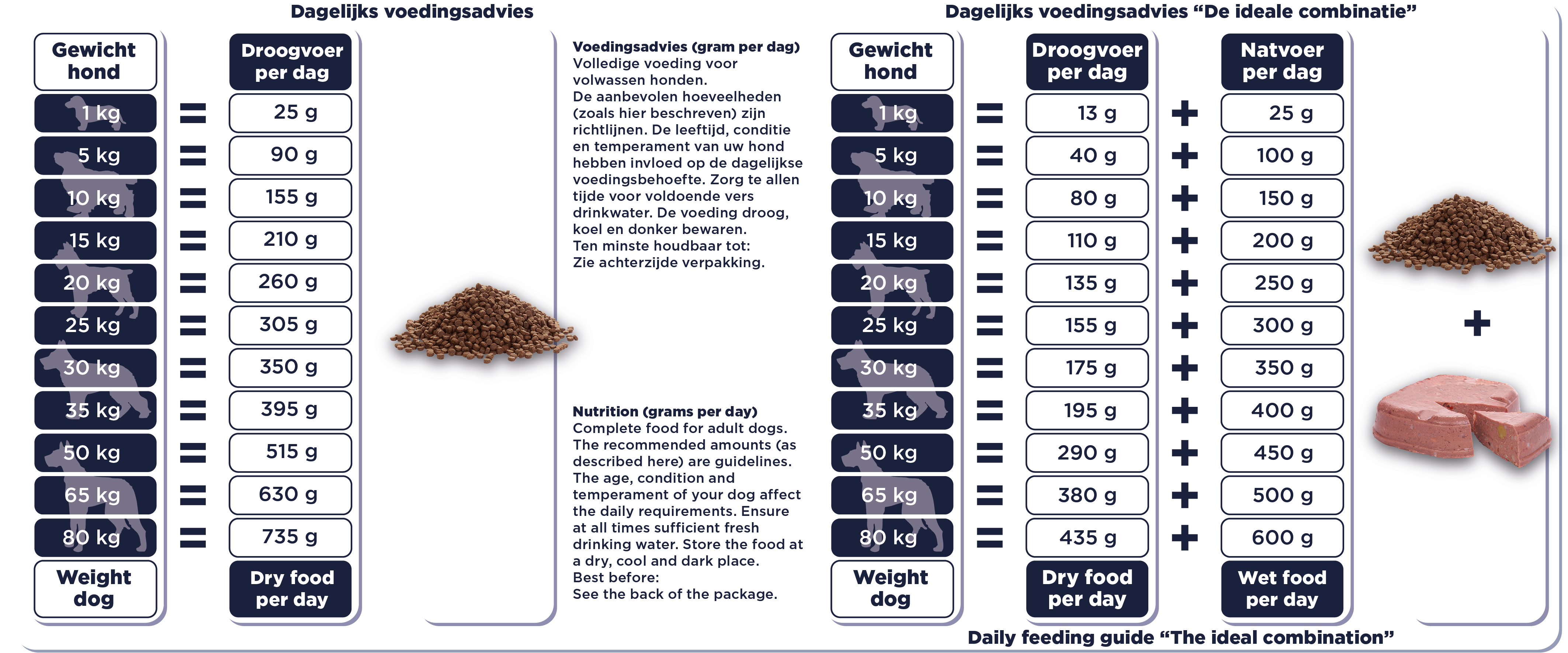 Nos aliments secs sont tous complets, ce qui signifie qu'ils contiennent tous les nutriments dont votre chien a besoin. Vous pouvez changer les croquettes ou les combiner avec nos Repas de Viande fraîche, même en un seul repas. Nous recommandons, dans la mesure du possible, de varier beaucoup les saveurs. Cela permettra de maintenir le système immunitaire de votre chien en éveil, de veiller à ce que votre chien ne développe pas rapidement des intolérances ou des allergies et à ce qu'il ne s'ennuie pas facilement. Nous n'aimons pas manger la même chose tous les jours, n'est-ce pas ?