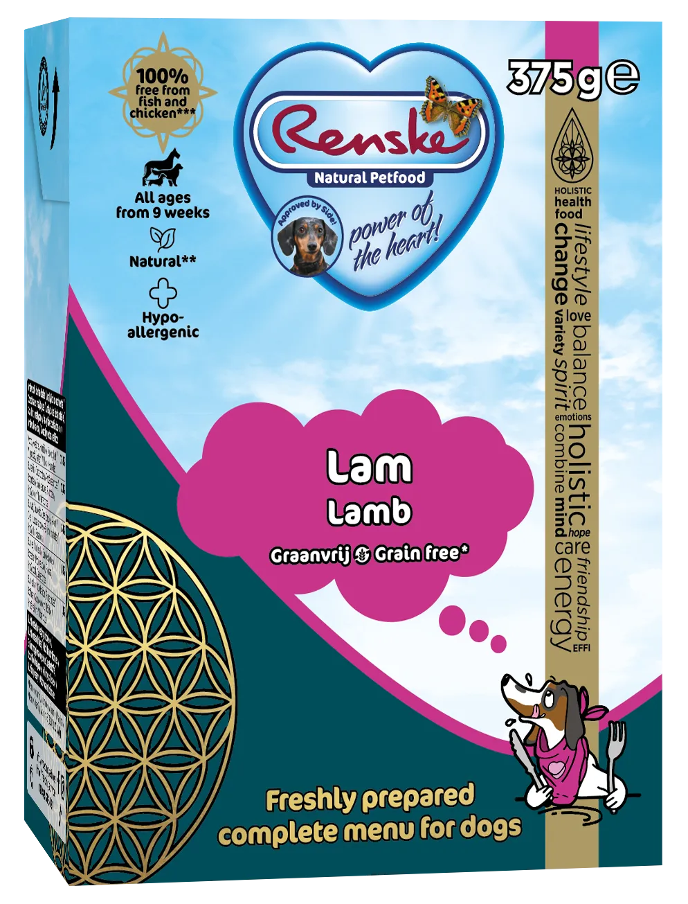 Agneau 70 %, pomme de terre 4 %, huile d'olive 2,4 %, petits pois 1 %, carottes 1 %, minéraux 0,5 %, algues séchées (fucus vesiculosus) 0,3 %, xylo-oligosaccharides, argousier, extrait de yucca schidigera.