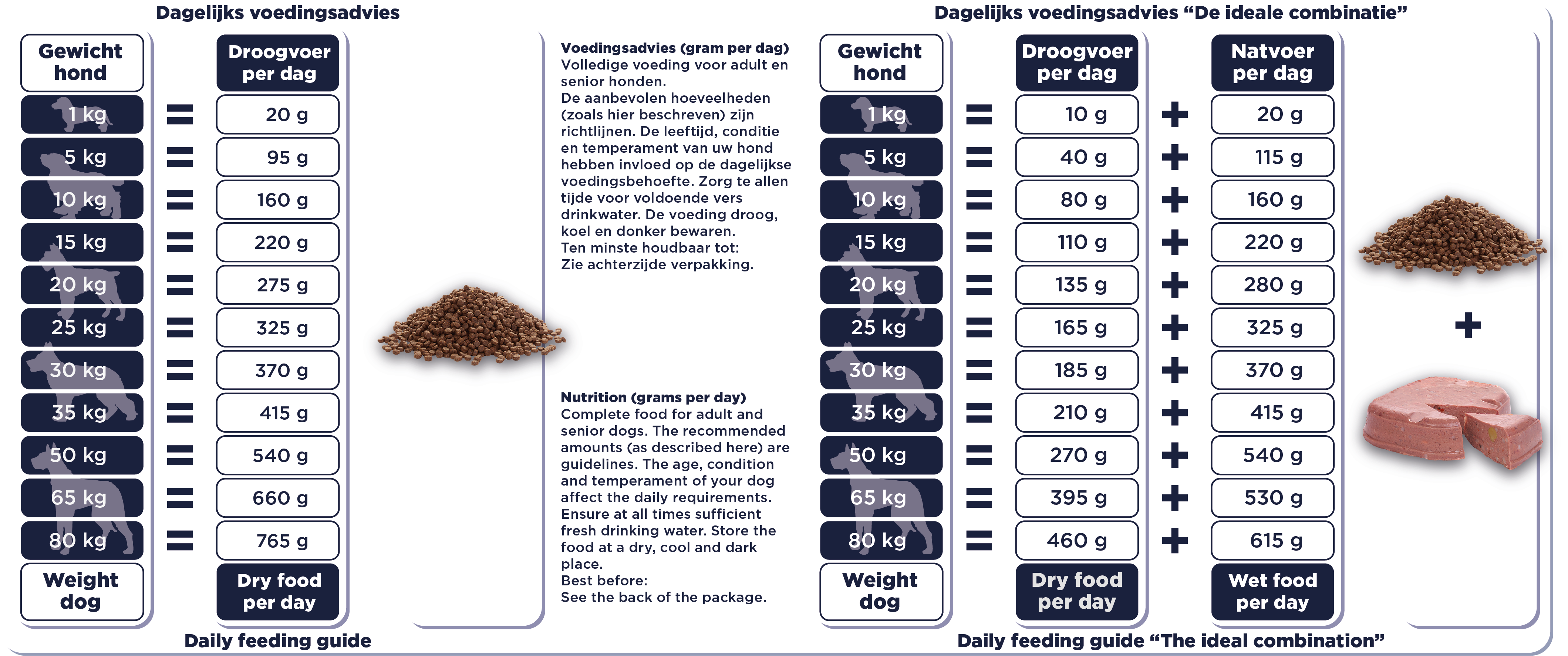 Nos aliments secs M.O.P. sont complets, c’est-à-dire qu’ils contiennent tous les nutriments dont votre chien a besoin. Vous pouvez changer les croquettes ou les combiner avec nos Repas de Viande fraîche, cela peut même être fait en un seul repas.