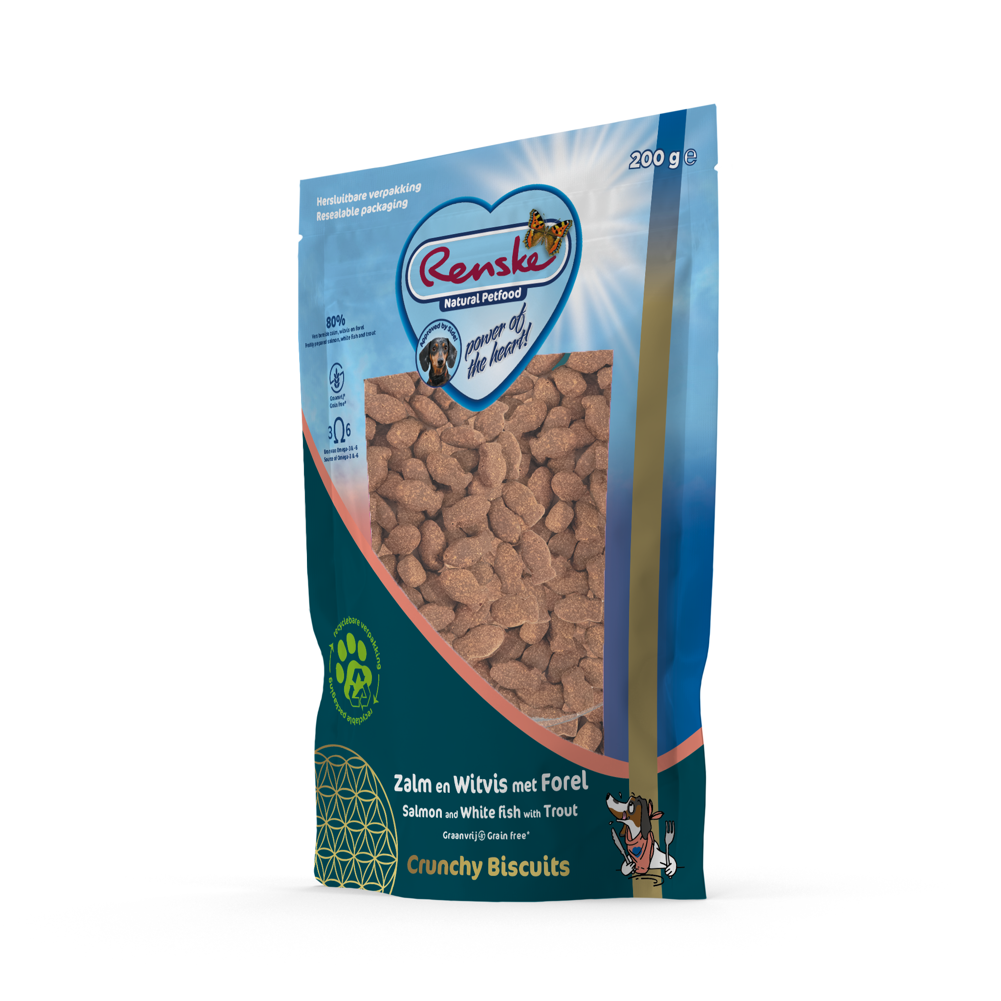 Les biscuits croustillants au saumon et poisson blanc avec truite Renske sont un bon ajout savoureux au menu quotidien de votre chien. Vous pouvez offrir cette récompense à votre chien comme friandise en guise de collation.