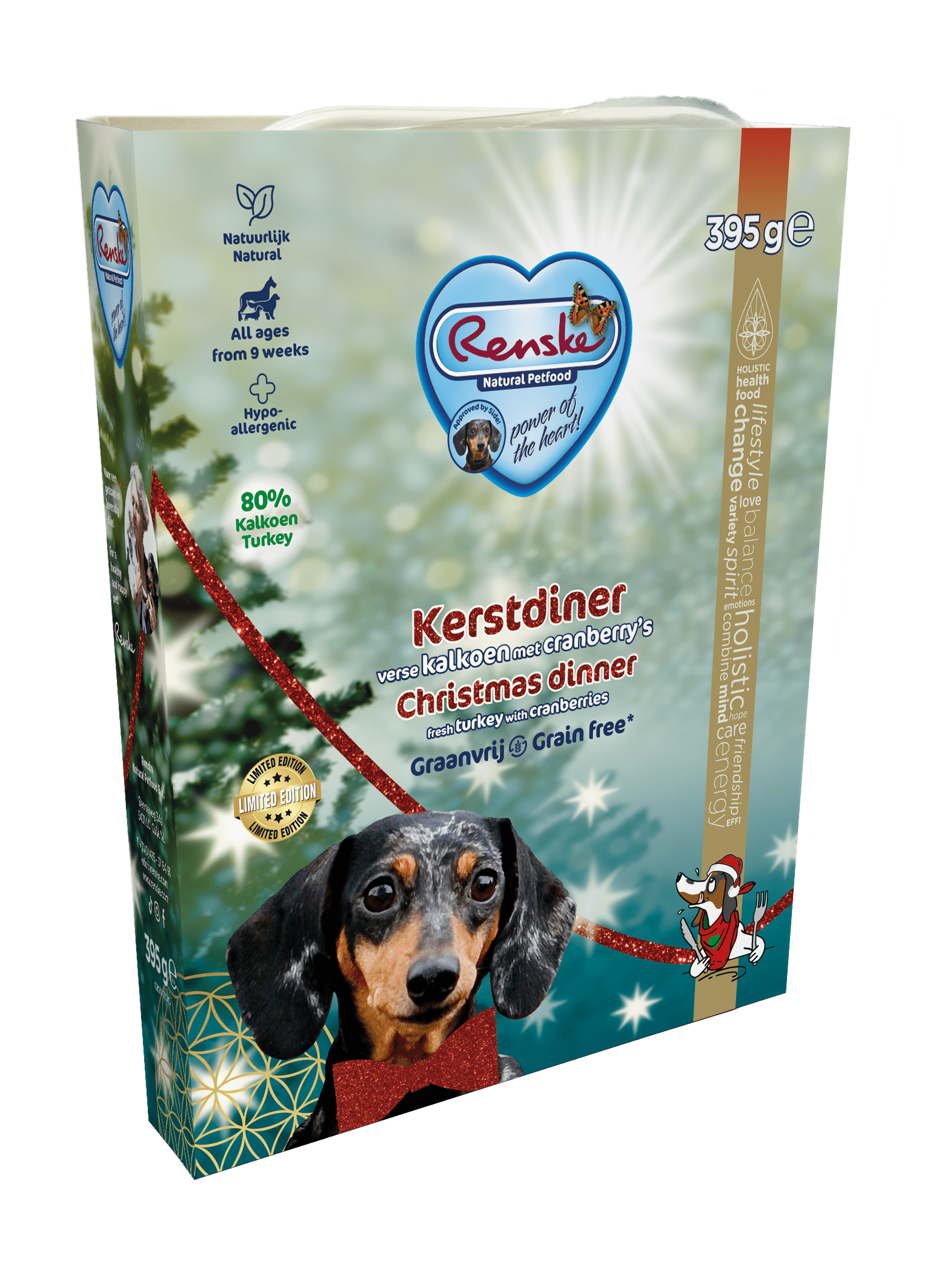 Le Renske Frais Dîner de Noël Repas de viande cuite à l’étuvée est un repas pour les chiens jeunes et adultes de toutes races à partir de 9 semaines.