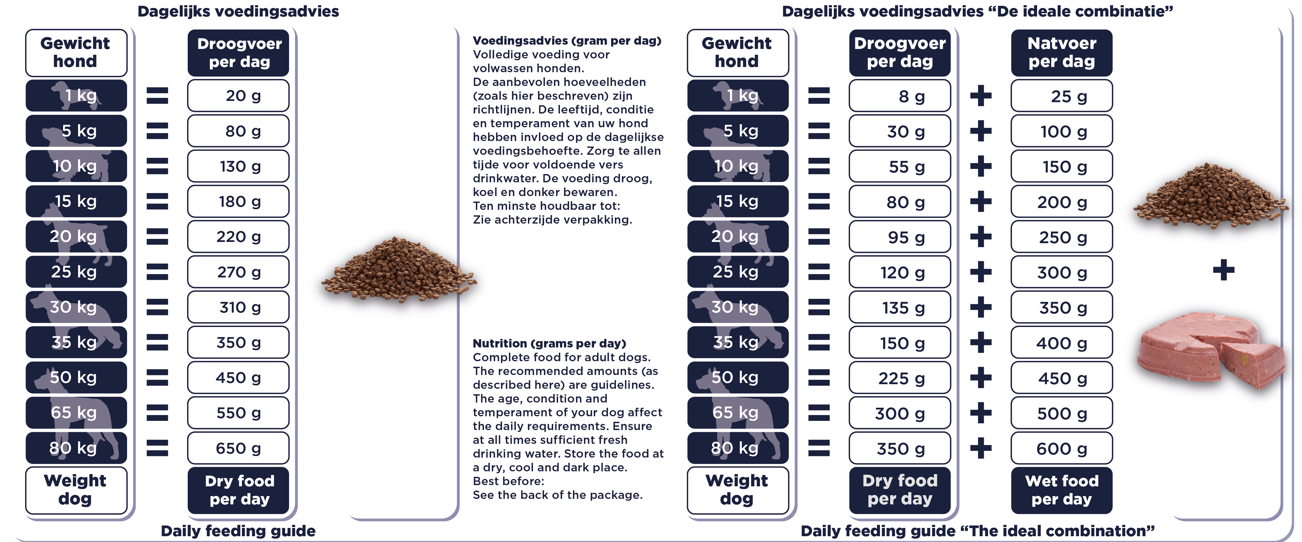 Nos aliments secs sont tous complets, ce qui signifie qu'ils contiennent tous les nutriments dont votre chien a besoin. Vous pouvez changer les croquettes ou les combiner avec nos Repas de Viande fraîche, même en un seul repas. Nous recommandons, dans la mesure du possible, de varier beaucoup les saveurs. Cela permettra de maintenir le système immunitaire de votre chien en éveil, de veiller à ce que votre chien ne développe pas rapidement des intolérances ou des allergies et à ce qu'il ne s'ennuie pas facilement. Nous n'aimons pas manger la même chose tous les jours, n'est-ce pas ?