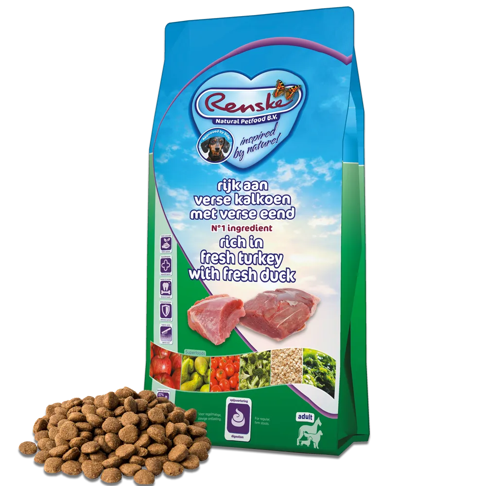 Il est préférable de commencer par donner uniquement des Renske Repas de Viande fraîche pendant trois jours, cela fournit les enzymes digestives nécessaires aux intestins. Ensuite, vous pouvez introduire les croquettes Renske. Celles-ci peuvent être mélangées avec les Repas de Viande fraîche. Vous pouvez alors passer entièrement aux aliments secs, continuer à mélanger est également une option. En raison de la forte teneur en viande ou en poisson frais de notre alimentation, nos produits sont très facilement digestibles. Cela ne pose donc que rarement des problèmes lors de la transition.