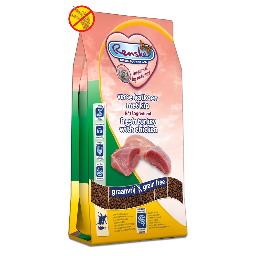 Wist je dat er meer calcium moet zitten in kittenvoer dan fosfor? Onze Renske Super Premium droogvoer vers bereide kalkoen met kip bestaat voor 1,15% uit calcium en voor 0,95% uit fosfor.