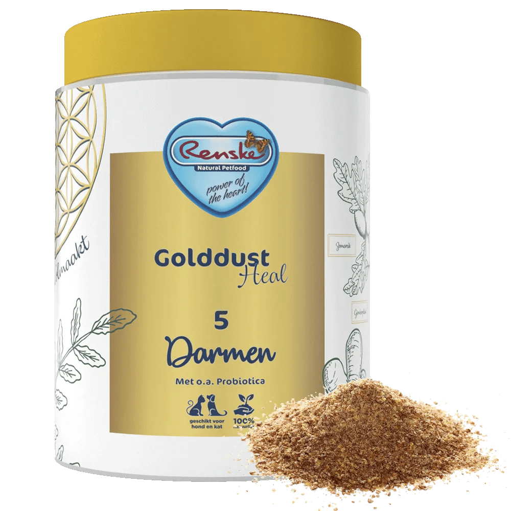 - Probiotica: Sommige producten van Renske bevatten probiotica, wat levende micro-organismen zijn die gunstig zijn voor de darmflora. Ze dragen bij aan de balans van goede bacteriën in de darmen. Het supplement Golddust Heal 5. Darmen bevat zowel prebiotica als probiotica. De probiotica in de Golddust Heal 5. Darmen is afkomstig van melkzuurbacteriën, ook wel lactospore genoemd. Deze goede bacteriën komen in de darmen terecht en worden daar actief. De prebiotica in de vorm van fructo-oligosaccharides (FOS) zijn de voedingsvezels voor de probiotica. De FOS wordt opgenomen door de lactospore en zorgt ervoor dat deze goede bacteriën kunnen groeien en de darmflora weer perfect in balans komt. Dit versterkt het immuunsysteem, helpt ontlasting weer dikker te maken en een natuurlijke stoelgang te krijgen.