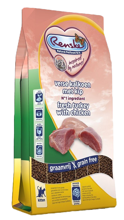 Kittens tot een jaar oud kan je het beste speciale kittenvoeding geven. Dit voer voldoet namelijk aan de belangrijke voedingsstoffen voor de groei van kittens, zoals voldoende eiwitten, calcium en vitamine A. Onze Renske Super Premium droogvoer vers bereide kalkoen met kip is een complete, licht verteerbare voeding. Met een hoog vlees gehalte en uitgebalanceerde eiwitten en vetten helpen deze brokjes je kitten om een goede eter te worden en goed te groeien. Wij adviseren om naast kitten brokjes de voeding aan te vullen met Renske natvoer kat. Wil je meer weten over het verschil in deze voeding? Lees dan onze blog ‘wat is het beste kitten voer: brokjes of natvoer?’