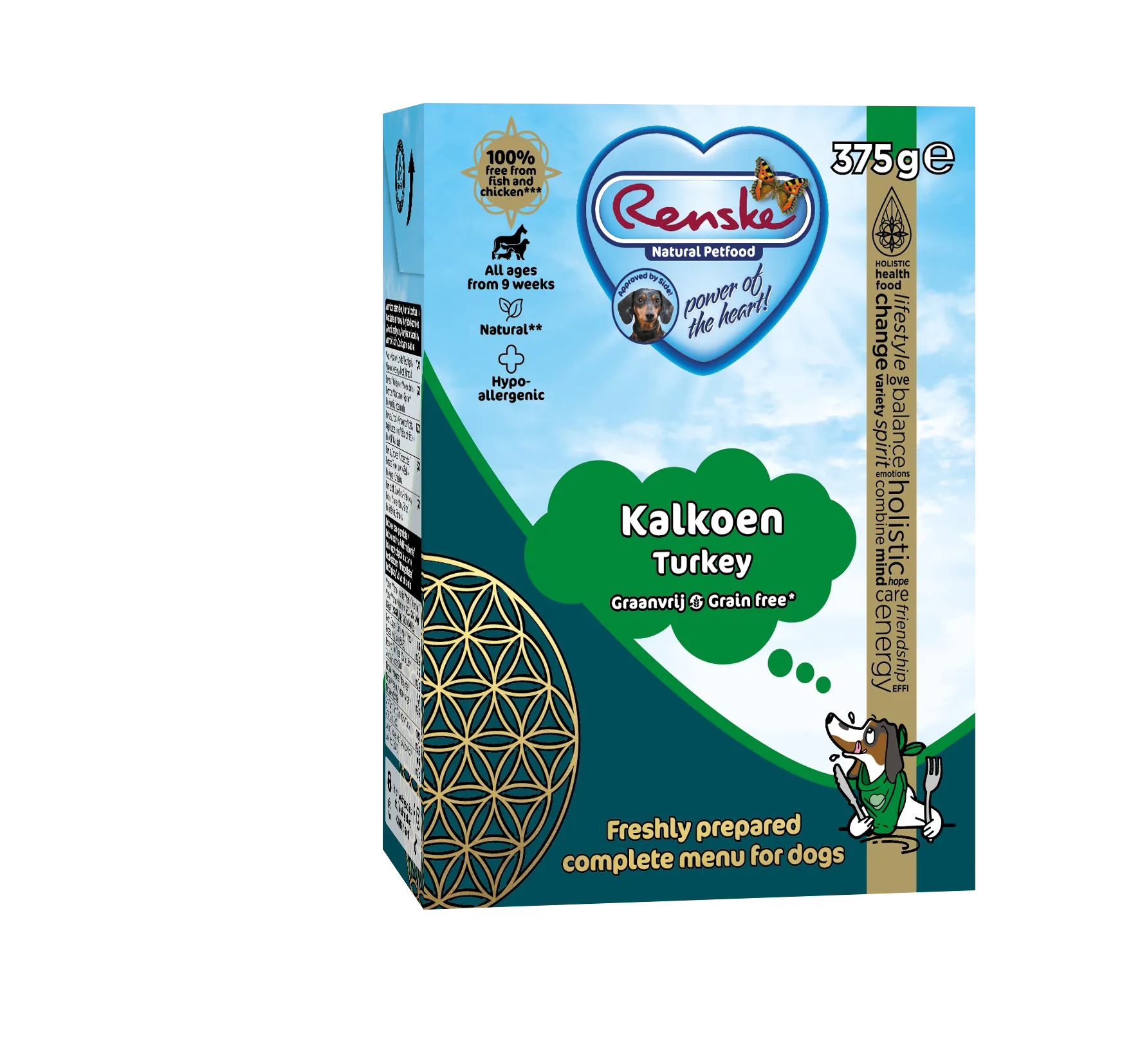 Renske vers bereide vleesmaaltijd met kalkoen is een complete, gluten- en graanvrije maaltijd voor jonge, volwassen en oude honden van alle rassen vanaf 9 weken. Het product bevat 55% vers bereide kalkoen en is aangevuld met heerlijke groenten. Door de hoogwaardige ingrediënten zijn de maaltijden licht verteerbaar en goed voor moeilijke eters! In handige kleine porties verpakt, ook ideaal voor onderweg of op vakantie.