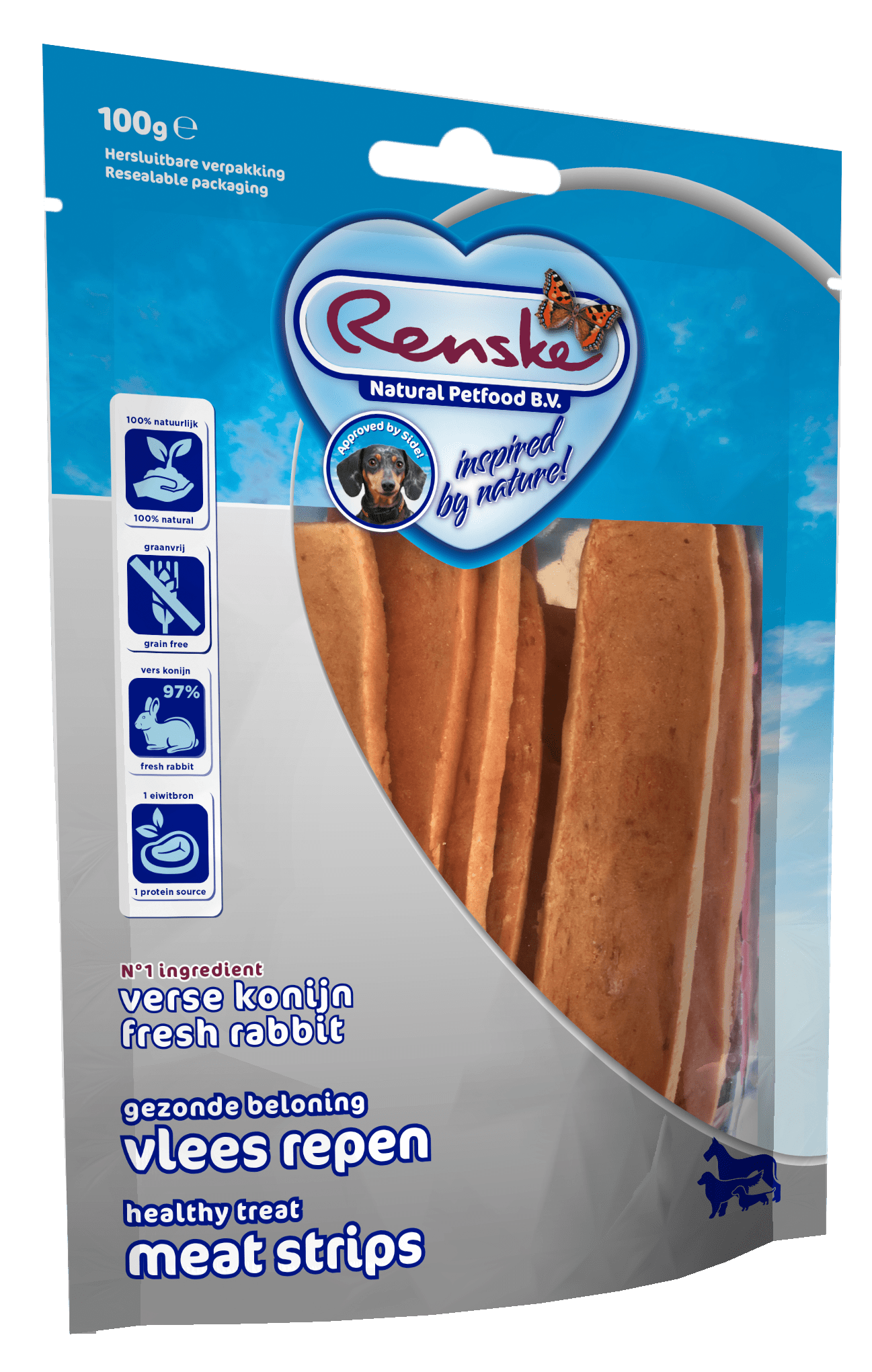 Renske Vlees Repen zijn een goede, smakelijke aanvulling op het dagelijkse menu van jouw hond. Met deze repen voorzie je direct in de natuurlijke kauwbehoefte van de hond. Kauwen is van belang voor een goed gebit. De Vlees Repen zijn gemakkelijk in kleinere delen te breken/scheuren, ideaal als trainingsbeloning of tussendoortje.