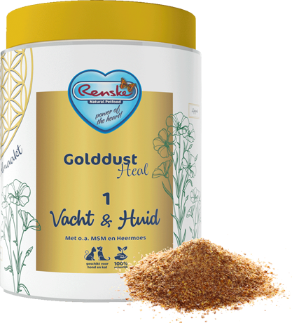 Golddust Heal – Vacht & Huid bevat een overvloed aan natuurlijke aanwezige vitaminen, mineralen, aminozuren, essentiële vetzuren en vezels. Het is de rijkste bron aan omega-3 vetzuren en plantaardige lignanen. Met een toevoeging van het werkzame kruid Heermoes. Golddust Heal is een 100% natuurlijke lijn voedingssupplementen speciaal voor honden en katten. De supplementen zijn allen ‘energetisch volmaakt’, wat betekent dat de ingrediënten zijn afgestemd op het energetische veld van jouw dier, waardoor het product beter zijn werk kan doen.