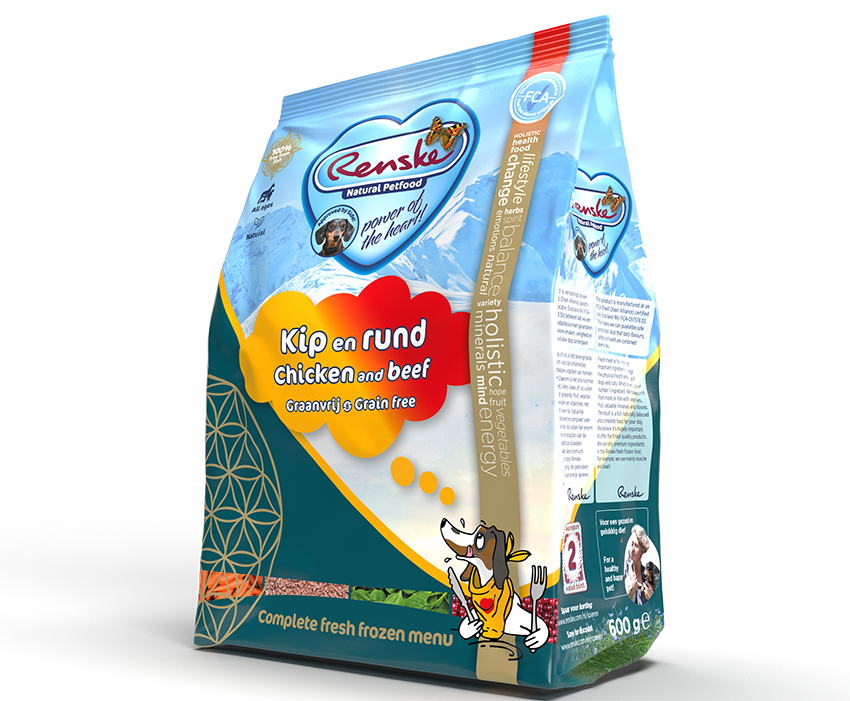 Renske's Vers Ingevroren Maaltijd met vers ingevroren kip & rund (graanvrij) is een volledig diervoeder voor pups en volwassen honden vanaf 3 weken.