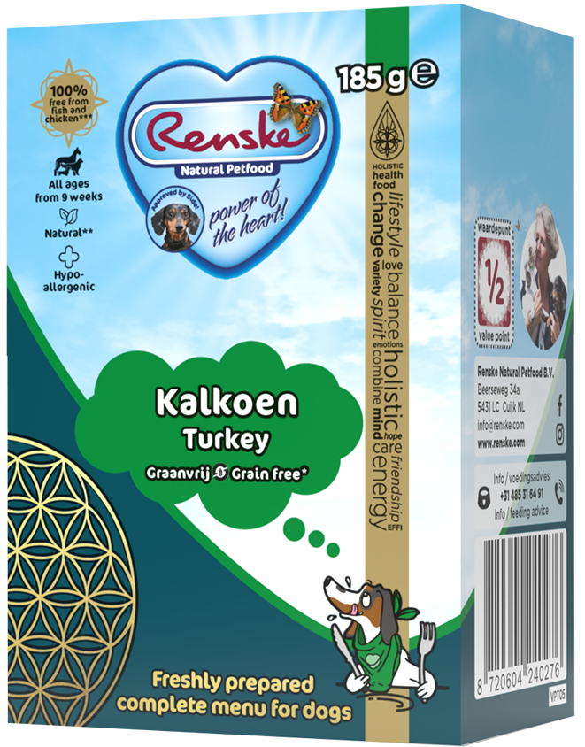 Renske vers bereide vleesmaaltijd met kalkoen is een complete, gluten- en graanvrije maaltijd voor jonge, volwassen en oude honden van alle rassen vanaf 9 weken. Het product bevat 55% vers bereide kalkoen en is aangevuld met heerlijke groenten. Door de hoogwaardige ingrediënten zijn de maaltijden licht verteerbaar en goed voor moeilijke eters! In handige kleine porties verpakt, ook ideaal voor onderweg of op vakantie.