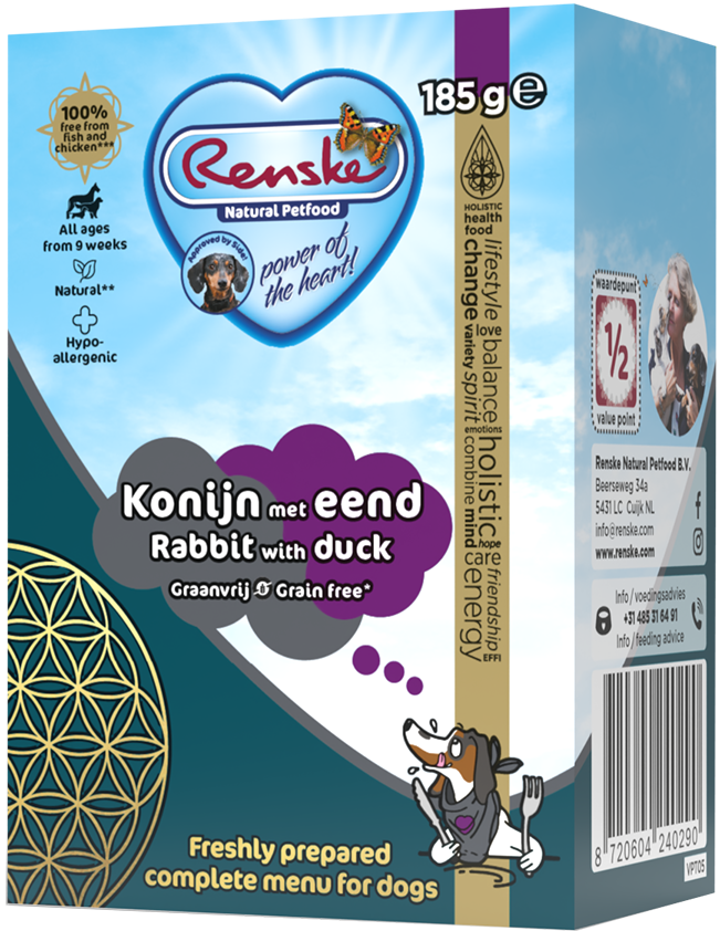 Renske vers bereide vleesmaaltijd konijn met eend is een complete, gluten- en graanvrije maaltijd voor jonge, volwassen en oude honden van alle rassen vanaf 9 weken. Het product bevat 60% vers bereide konijn met eend en is aangevuld met heerlijke groenten. Door de hoogwaardige ingrediënten zijn de maaltijden licht verteerbaar en goed voor moeilijke eters! In handige kleine porties verpakt, ook ideaal voor onderweg of op vakantie.