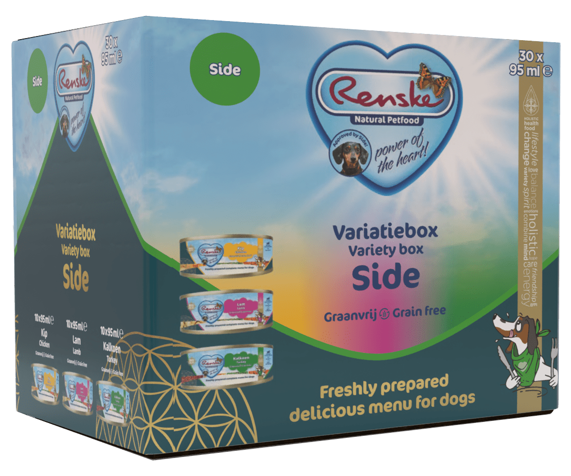 De Renske variatiebox Side is een handige variatieverpakking met drie heerlijke varianten Renske Vers Bereid 95g! Met deze box kun je gemakkelijk variëren en combineren. De box bevat 10x kip (graanvrij), 10x lam (graanvrij) en 10x kalkoen (graanvrij).