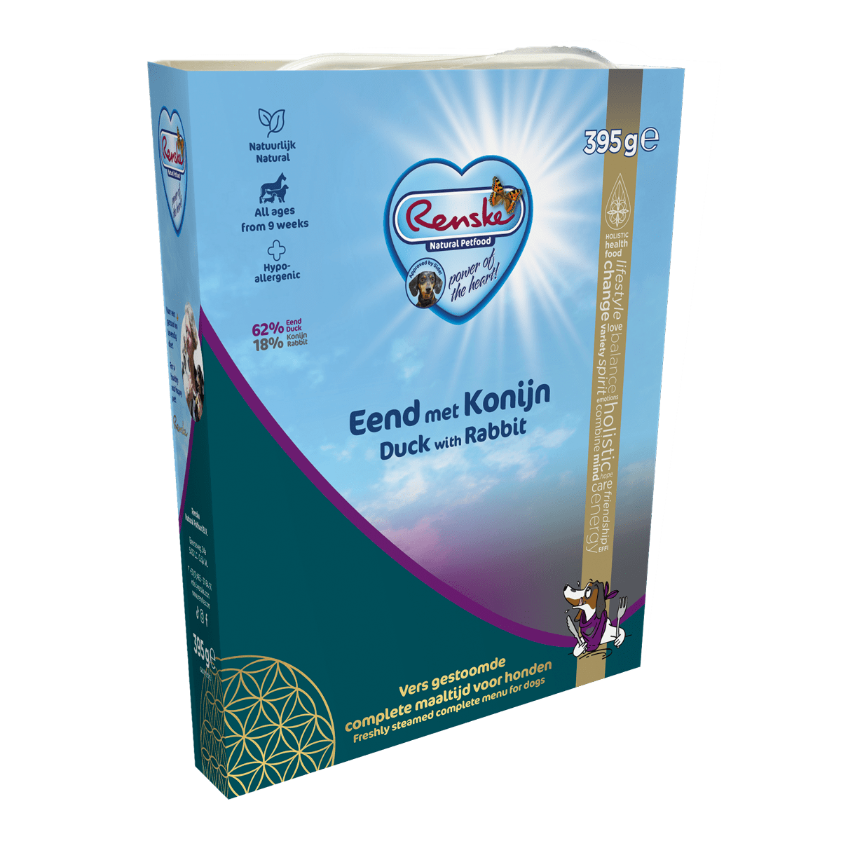 Renske Vers Gestoomde Vlees Maaltijd met eend en konijn is een vlees maaltijd voor jonge en volwassen honden van alle rassen vanaf 9 weken. Het product bevat minimaal 80% vers gestoomde eend en konijn en is aangevuld met wat volkoren rijst, duurzaam geteelde moestuin groenten en kruiden.