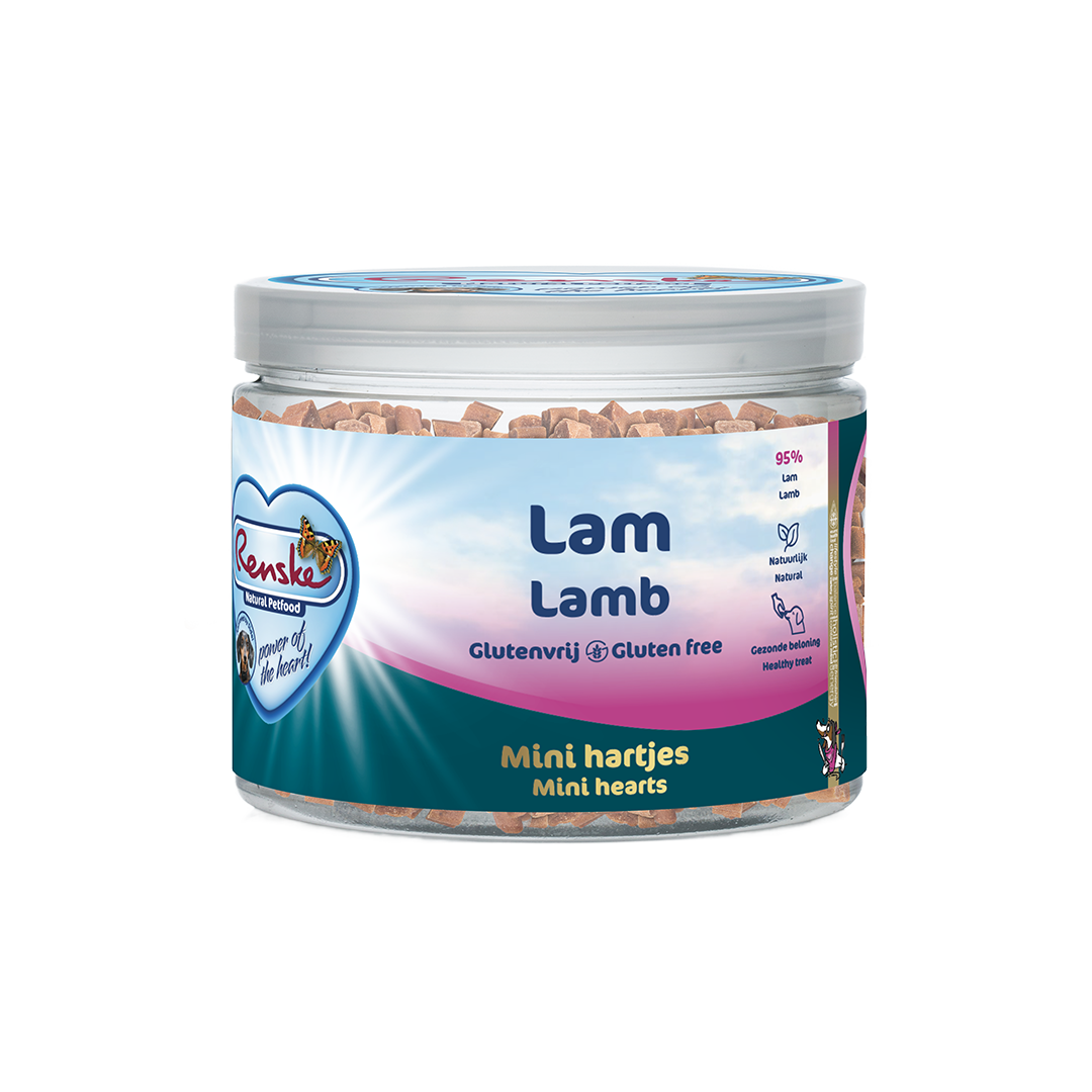 Ideaal als verantwoord tussendoortje of trainingssnoepje! Een beloning in hartjesvorm met als hoofdingrediënt lam, 95%. De beloningen zijn geschikt voor honden van alle rassen, vanaf 9 weken. Ideaal in combinatie met het variatiemenu van Renske. Ook in deze beloning is maar één eiwitbron gebruikt. Zo kunnen ook honden met een allergie of intolerantie voor een bepaalde eiwitbron van de beloningen genieten.