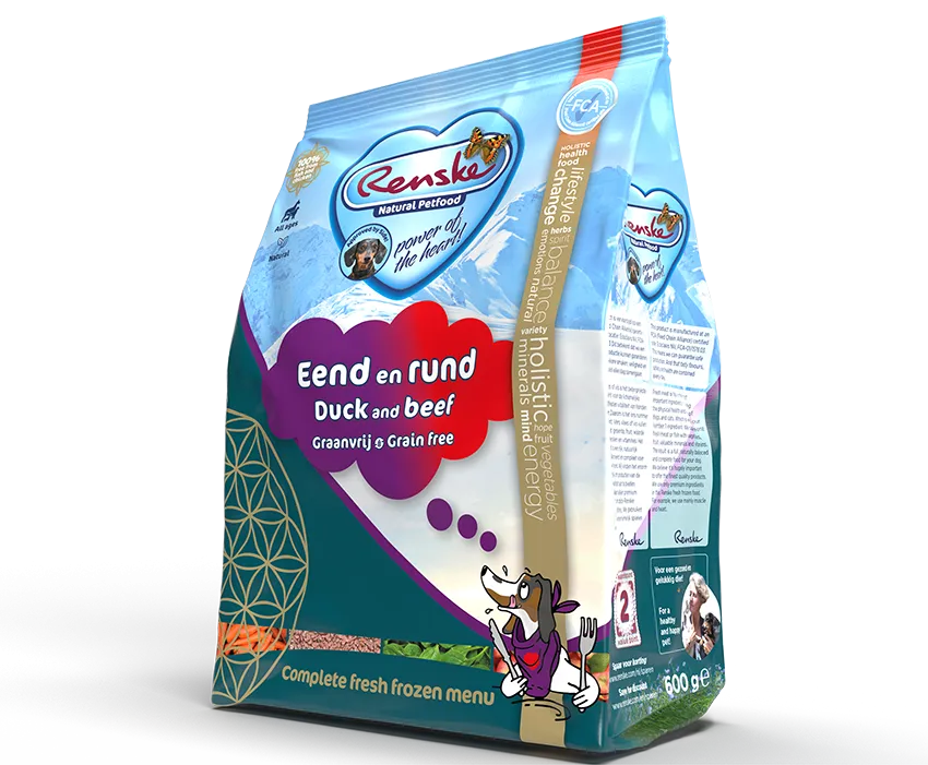 Renske's Vers Ingevroren Maaltijd met vers ingevroren eend & rund (graanvrij) is een volledig diervoeder voor pups en volwassen honden vanaf 3 weken.