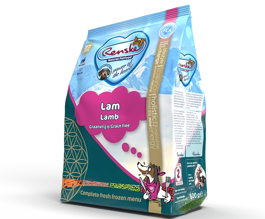 Renske's Vers Ingevroren Maaltijd met vers ingevroren lam (graanvrij) is een volledig diervoeder voor pups en volwassen honden vanaf 3 weken.