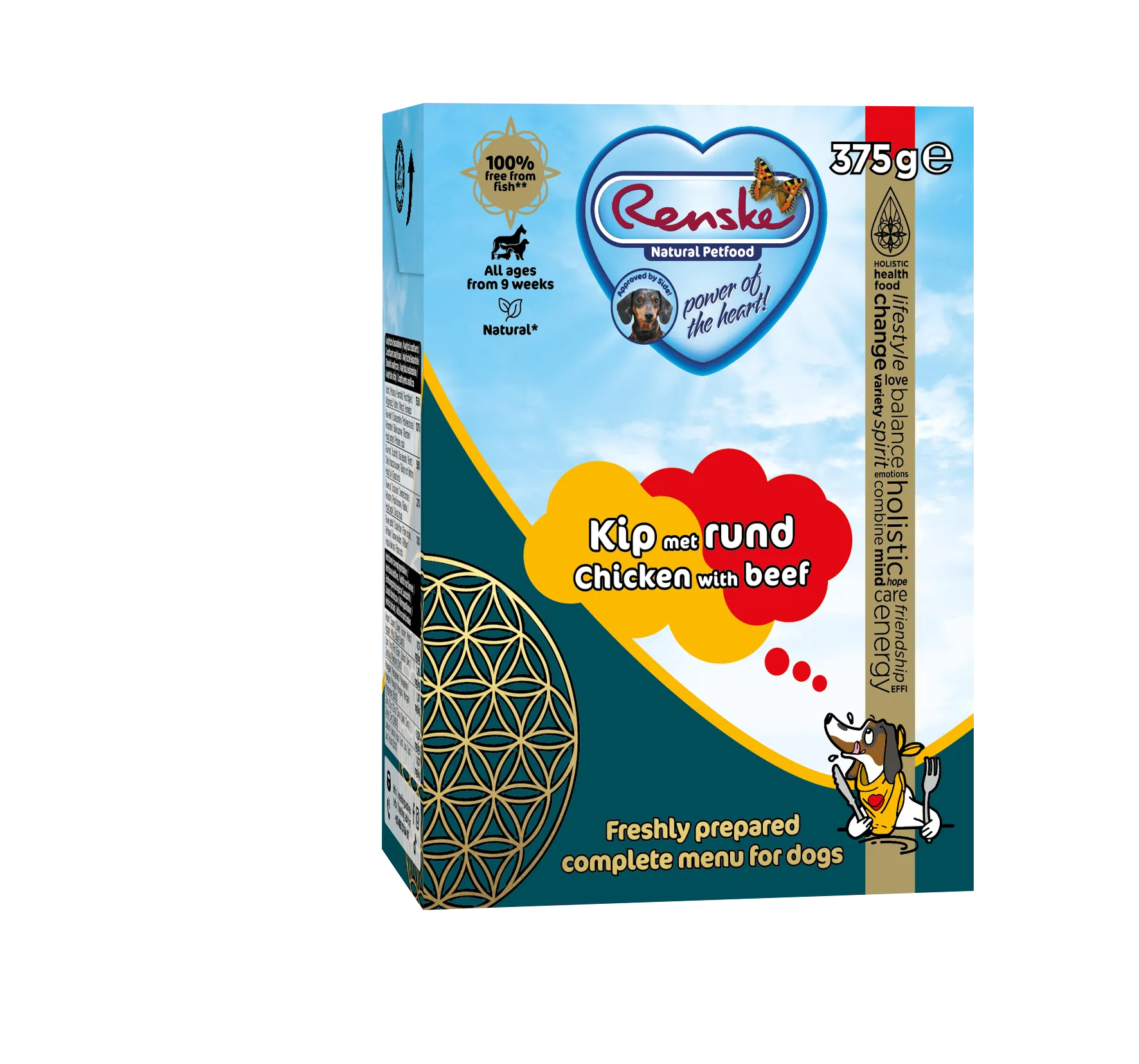 De vers bereide maaltijd kip met rund is verrijkt met duindoorn, gedroogde algen en yucca schidigera. Duindoorn zit boordevol natuurlijke antioxidanten, draagt bij aan de ontwikkeling van de hersenen en ondersteunt het herstellende vermogen van de huid en vacht van de hond. Daarnaast bevat deze maaltijd een natuurlijke bron van prebiotica: Xylo-oligosacchariden, welke een gezonde spijsvertering en gezond immuunsysteem ondersteunt. De gedroogde algen zitten boordevol omega-3 en jodium. Verder kan de toevoeging van yucca schidigera ondersteuning geven bij de meest voorkomende klachten waaronder klachten aan het maagdarmkanaal, huid, oren en gewrichten. Als laatste kan Yucca ook de ontlastingsgeur verminderen.