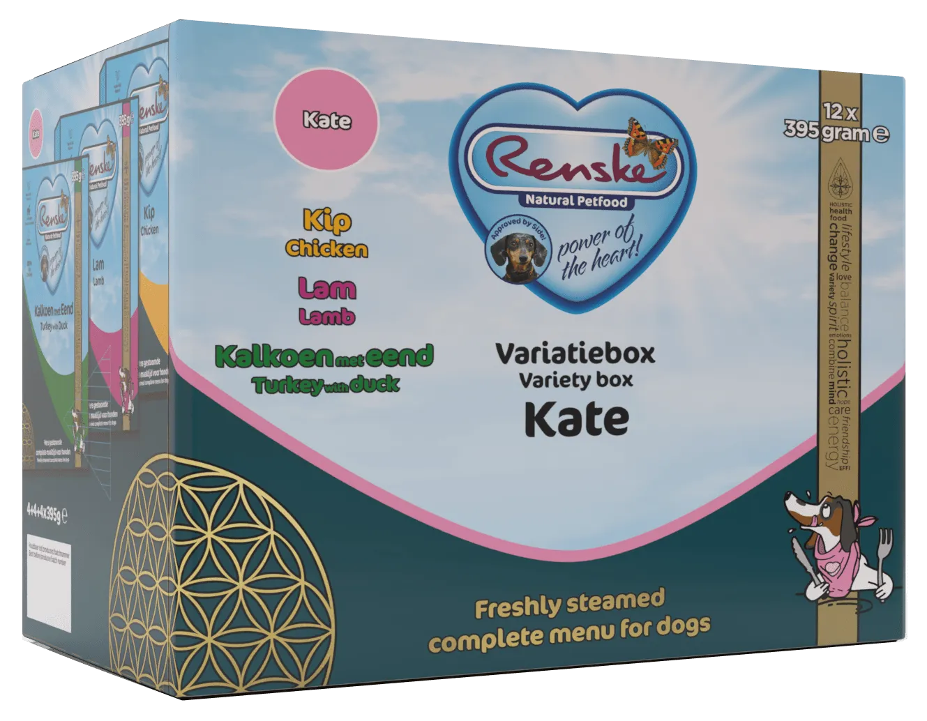 De Renske variatiebox Kate is een handige variatieverpakking met drie heerlijke varianten Renske Vers Gestoomd! Met deze box kun je gemakkelijk afwisselen. De box bevat 4x vers gestoomde kip, 4x vers gestoomde lam en 4x vers gestoomde kalkoen en eend.
