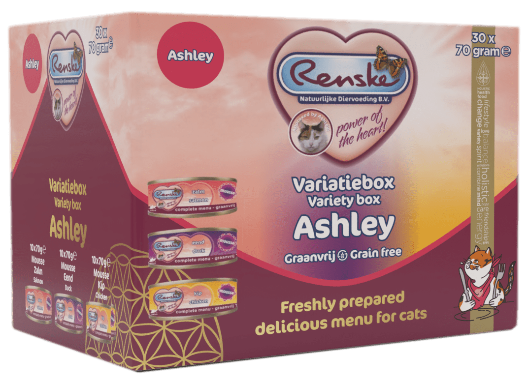 De Renske variatiebox Ashley is een handige variatieverpakking met drie heerlijke varianten Renske natvoer 70g mousse! Met deze box kun je gemakkelijk variëren en combineren. De box bevat 10x zalm - mousse, 10x eend - mousse en 10x kip - mousse.
