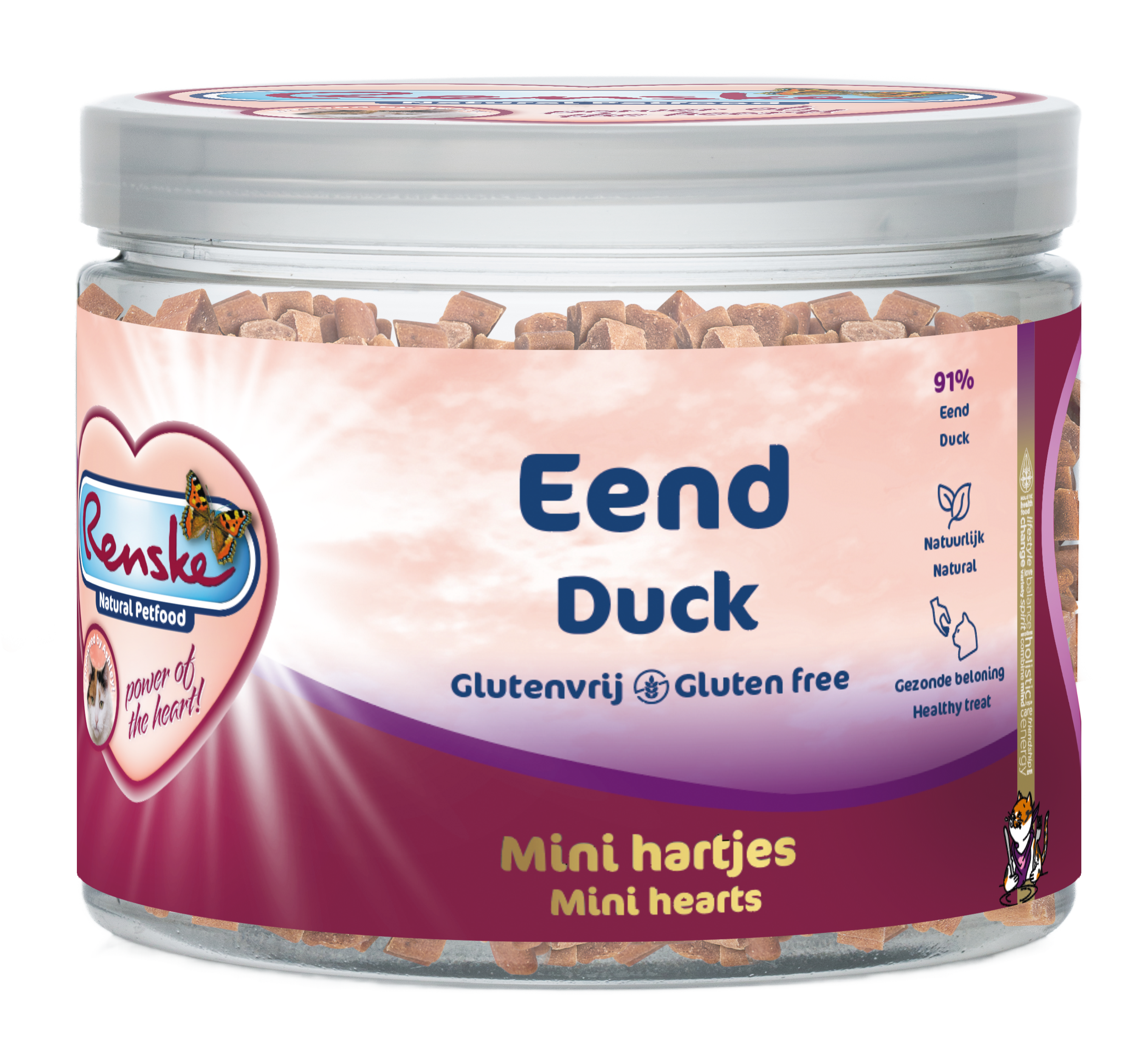 Een beloning in hartjesvorm met als hoofdingrediënt eend, 91%. De beloningen zijn geschikt voor katten van alle rassen, vanaf 9 weken. Ideaal in combinatie met het variatiemenu van Renske. Ook in deze beloning is maar één eiwitbron gebruikt. Zo kunnen ook katten met een allergie of intolerantie voor een bepaalde eiwitbron van de beloningen genieten.