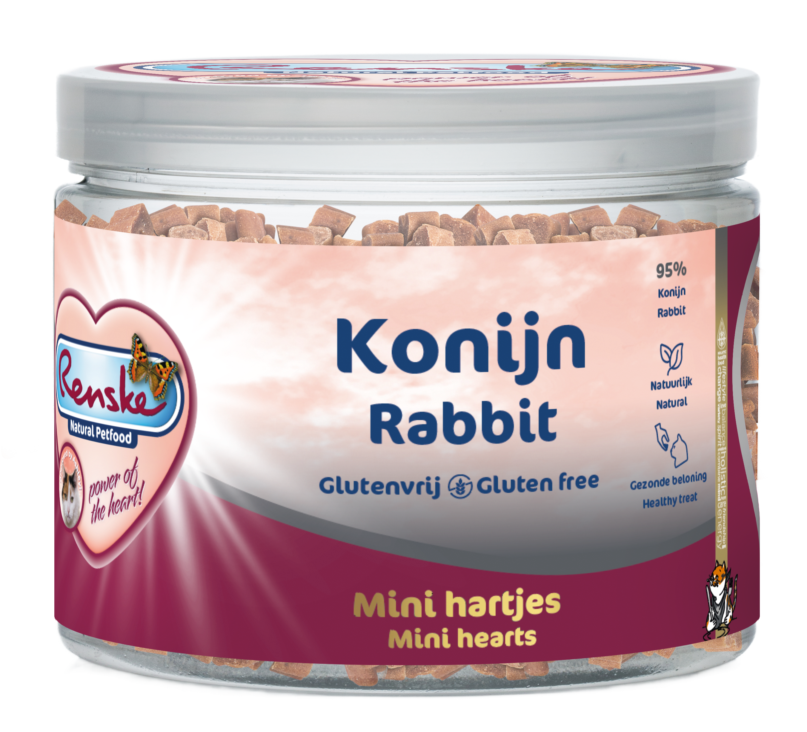 Een beloning in hartjesvorm met als hoofdingrediënt konijn, 95%. De beloningen zijn geschikt voor katten van alle rassen, vanaf 9 weken. Ideaal in combinatie met het variatiemenu van Renske. Ook in deze beloning is maar één eiwitbron gebruikt. Zo kunnen ook katten met een allergie of intolerantie voor een bepaalde eiwitbron van de beloningen genieten.