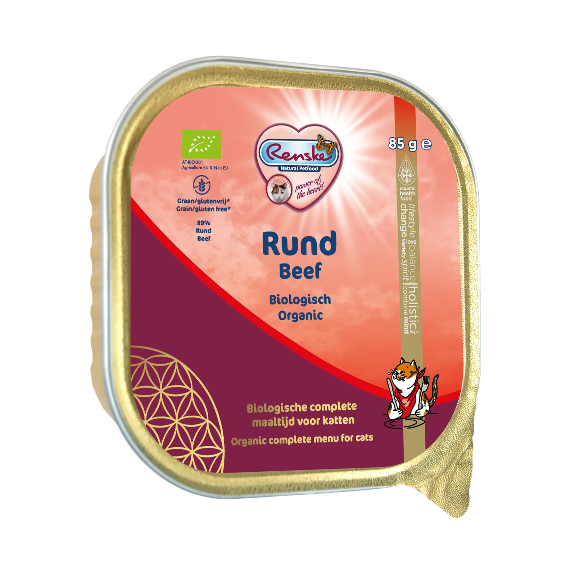 Renske's Biologische Vers Vlees Maaltijd met verse rund (graanvrij) is geschikt voor jonge, volwassen en oudere katten van alle rassen.