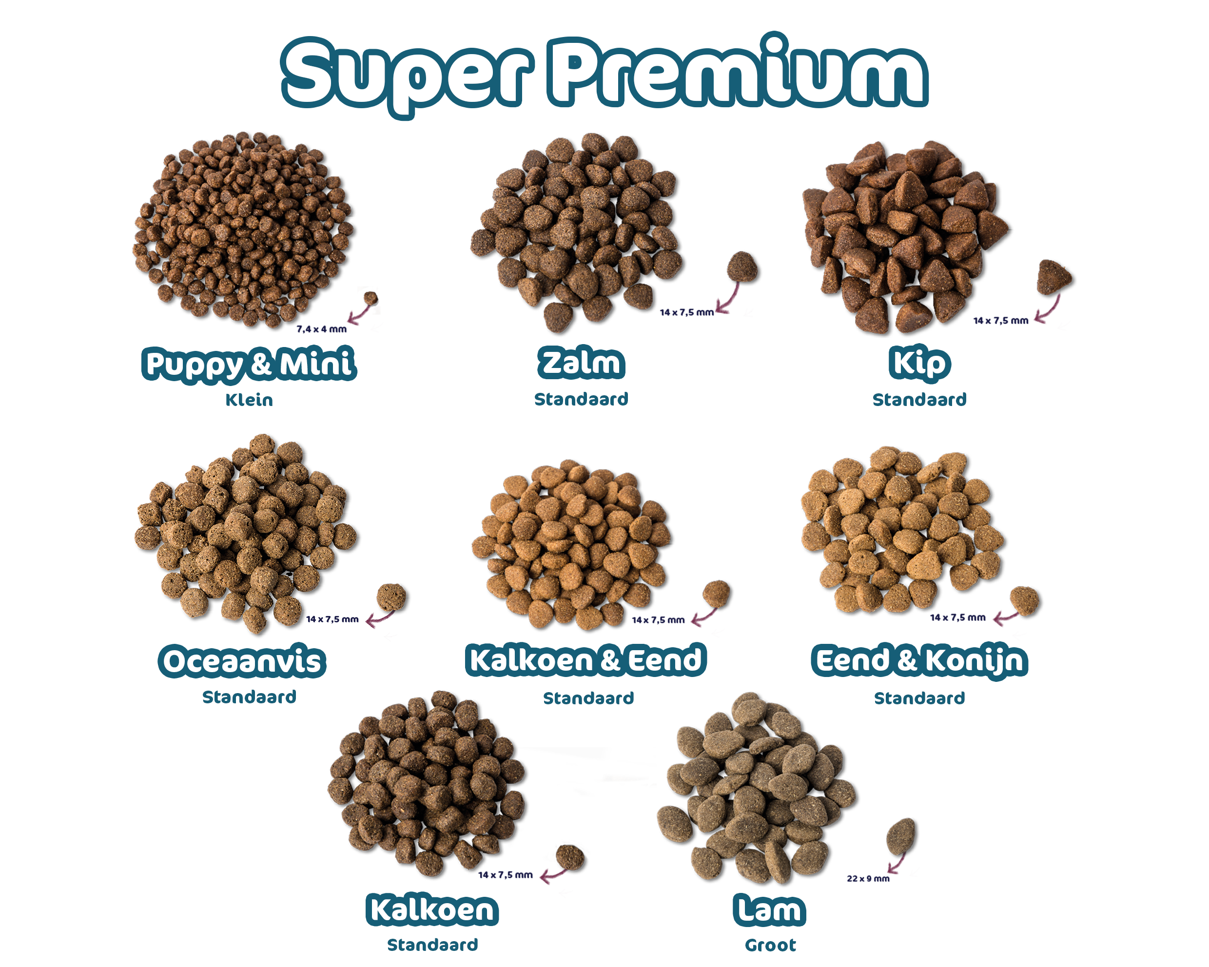 Wij raden je aan de verschillende smaken van onze Super Premium lijn aan te schaffen in een kleine verpakking. Je kunt deze brokjes introduceren als beloning en na een aantal dagen kun je deze brokjes als voeding gaan geven. Door het hoge vers vlees percentage zullen deze brokjes goed worden geaccepteerd door de darmen van de hond.