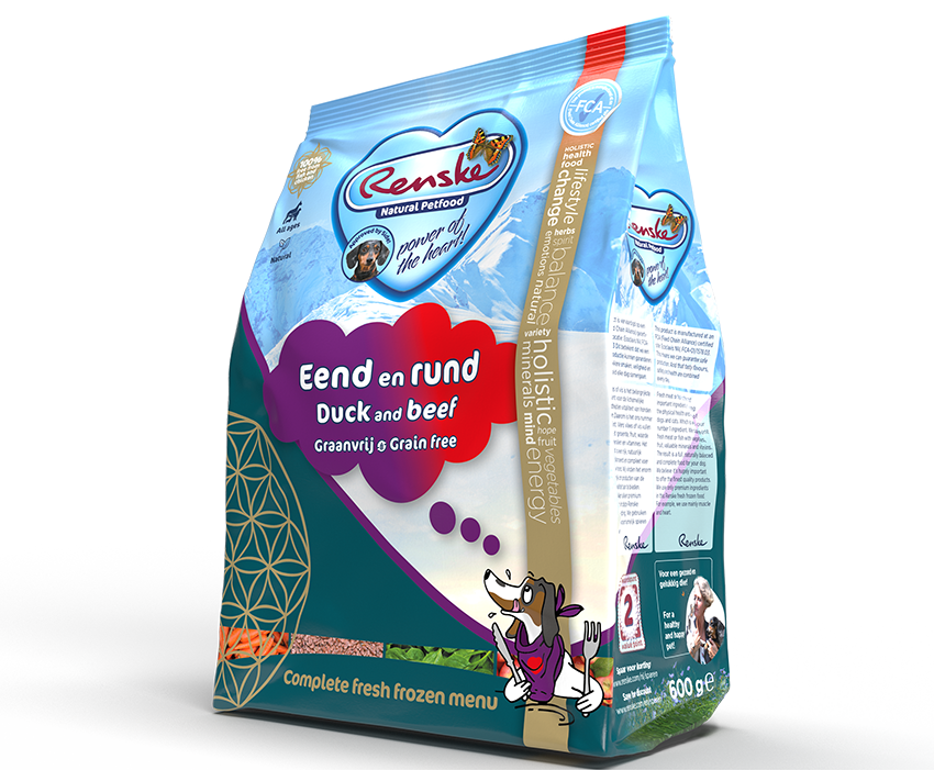Świeżo mrożony posiłek Renske ze świeżo mrożoną kaczką i wołowiną (bez zbóż) jest odpowiedni dla psów wszystkich ras od 1 roku życia.